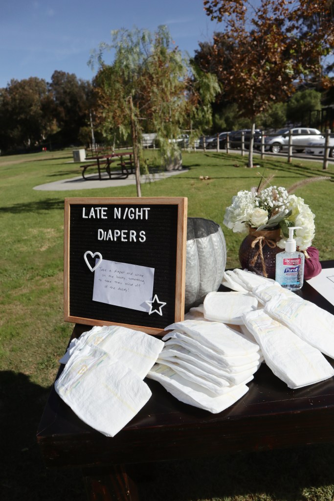 If you’ve never seen the “Late Night Diapers” game ^^^ , what you do is get a bunch of plain diapers and have guests write messages in sharpie on the diaper so that when you and/or your partner are changing diapers at 3 am, you read a funny message from one of your friends or family members.