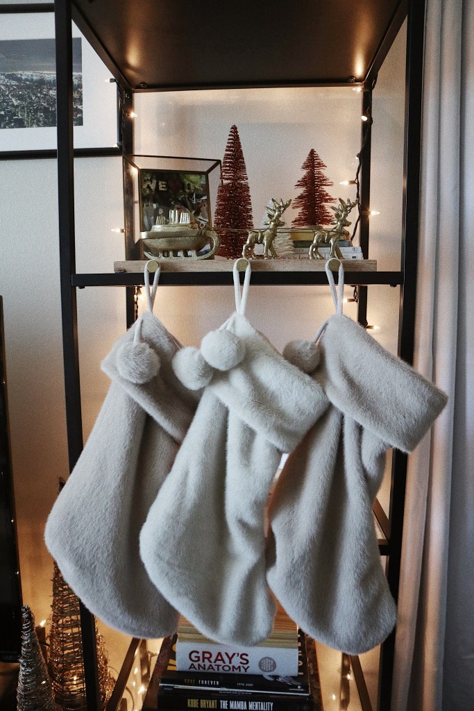 I bought our stockings from Target the other day and they’re so cute and soft! I love the neutral tones! We were considering having our names painted on them, but I think I’m deciding against that. I think keeping them plain might be the best way to go, to keep things simple.