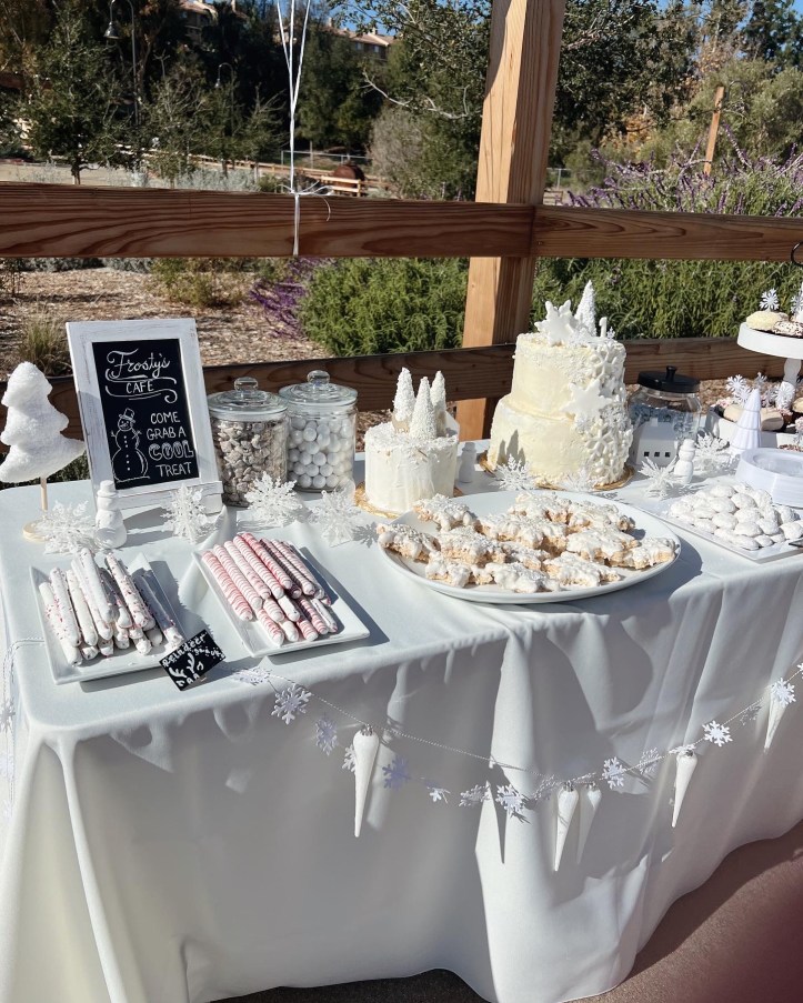 The dessert table was possibly the most fun to design/decorate. I really wanted to play with our theme and named the table “Frosty’s Cafe.” Joey made the sign himself and we filled the table with winter themed snacks like : reindeer snacks (white chocolate covered pretzels), snowballs (white Mexican wedding cake cookies), iscles (rock candy sticks), elf food (Sprinkles cupcakes), and of course Avery’s smash cake and the real cake, as well as some snowflake Rice Krispies!