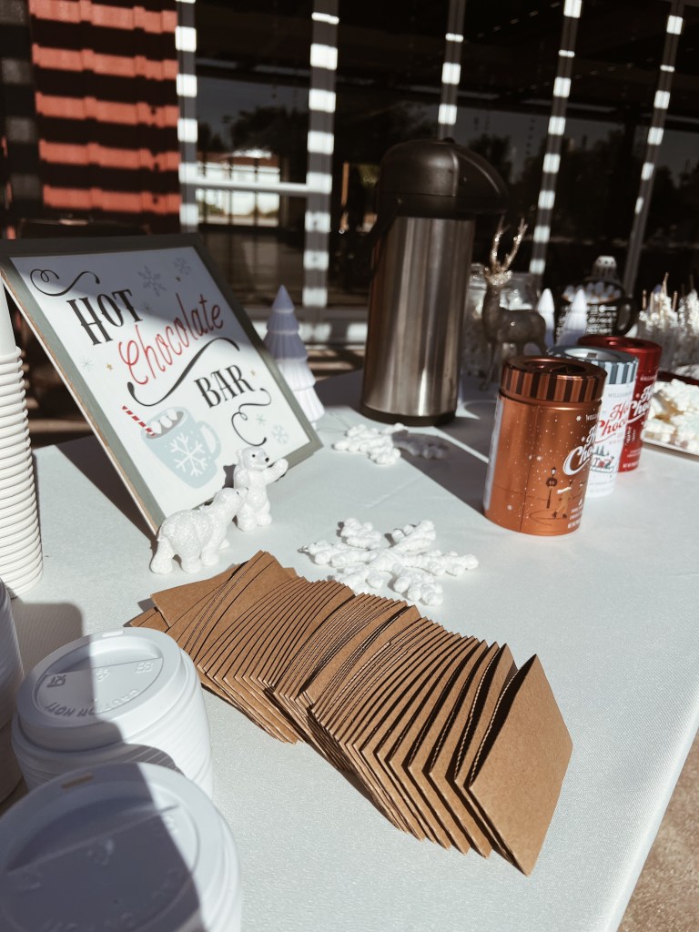 Next up was the hot cocoa bar! My favorite thing about winter is that it’s cold out, which instantly makes me want hot chocolate. I ended up buying three different flavors of hot cocoa from Williams Sonoma- original, double dark chocolate, and vanilla. Vanilla ended up being my favorite of the bunch. Then, we filled plates and canisters with white snowflake marshmallows!