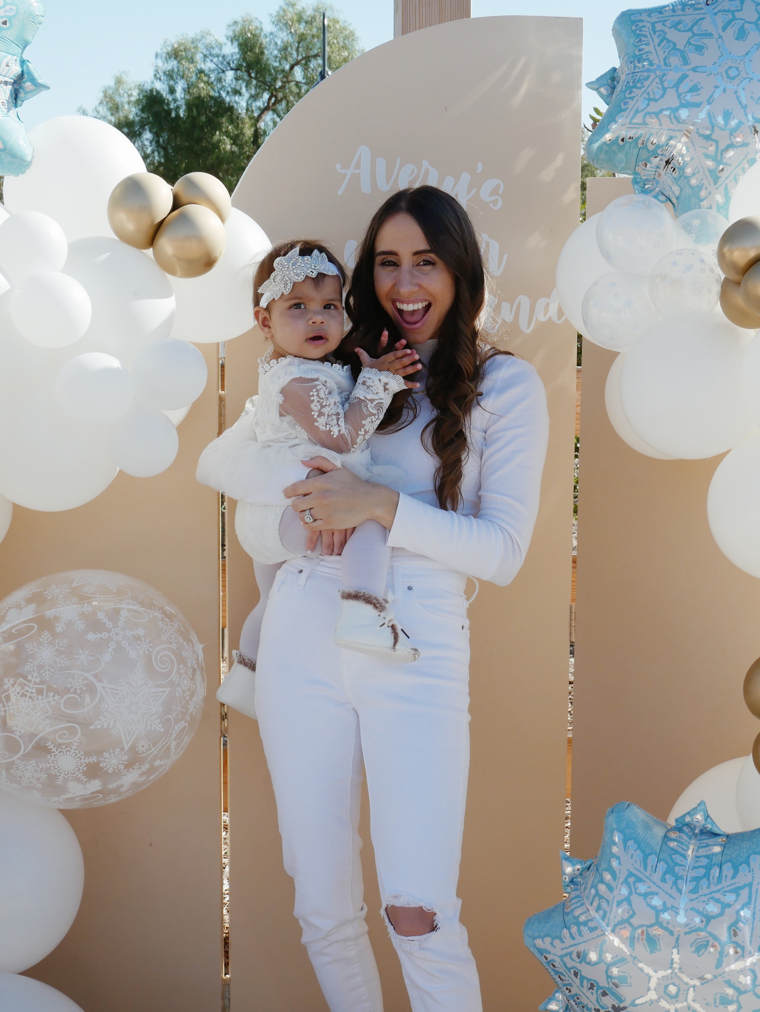 SO, the first thing I did while planning her party was search for a venue. I wanted a red barn to compliment my all white winter wonderland theme. Just the splash of red from a barn was all I wanted to help give that cozy, winter feel. We toured a few venues but when we saw Aliso Viejo Ranch, and realized it was like 10 minutes away from our house, we booked right away. It was PERFECT! Once I had our venue nailed down, I started to contact vendors. I knew I wanted an all white bounce house and found Lux Inflatables on Instagram and Sara- the owner, was ABSOLUTELY AMAZING to deal with! She was so responsive with all my questions and even sent me over a list of vendors she’d worked with in the past for decorative items- like the balloon garland I needed to decorate the bounce house!. She made everything SO easy and I cannot recommend her enough if you’re throwing a party and are in need for a bounce house (in the greater LA/OC areas) ! Here is a link to her website 🙂