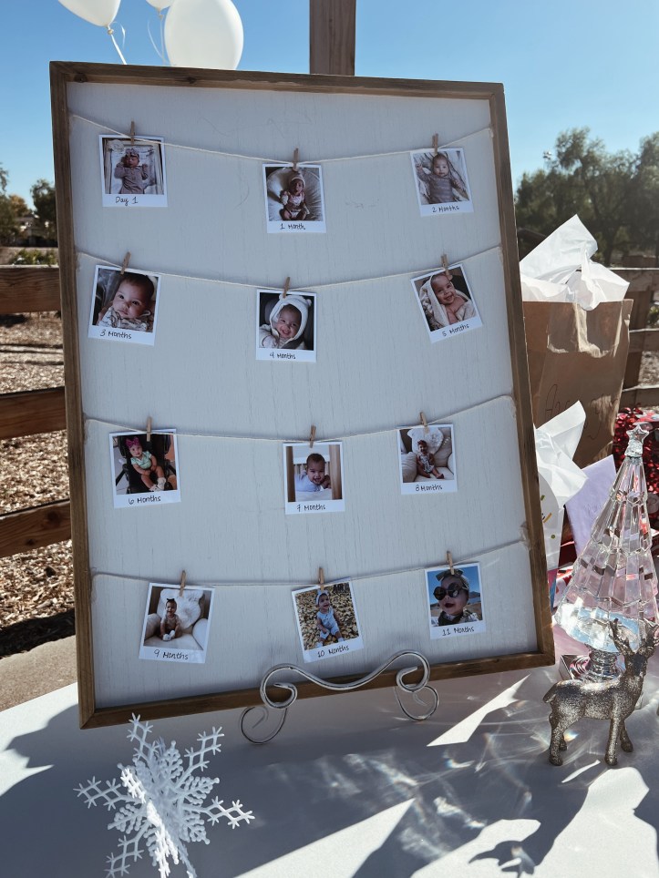 To the left of the high chair, I set up a guest book table for gifts/cards. I also set up a little photo album where guests could snap a polaroid picture, stick it in the album, and then write a birthday message to Avery. Avery’s Godmother, Natalie, set the same thing up at our baby shower and I just love the idea so much. It’s such a cute and easy keepsake of the day and something that Avery can look through in the future to remember who celebrated her first birthday with her. I also framed an ultrasound photo and had a little 1-11 month old photo board set up on the guest table as well! The little 1-11 month frame now hangs in our bedroom.