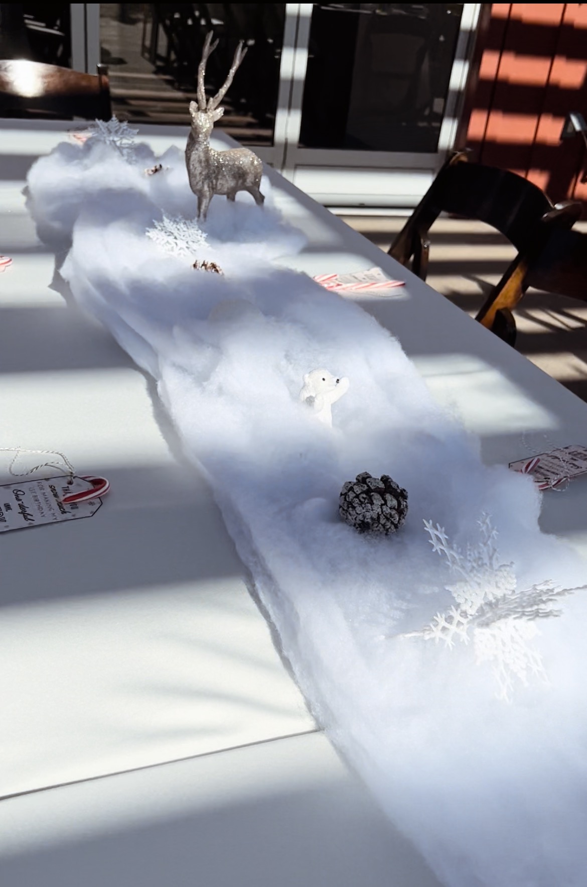 The seating tables were the next fun thing for me to plan! I wanted the tables to go under the pergola which was directly next to the red ranch doors. I bought cotton ball garlands from a home decor store to hang from the pergola to give the illusion of snow, and this was perhaps my favorite detail of the entire space!