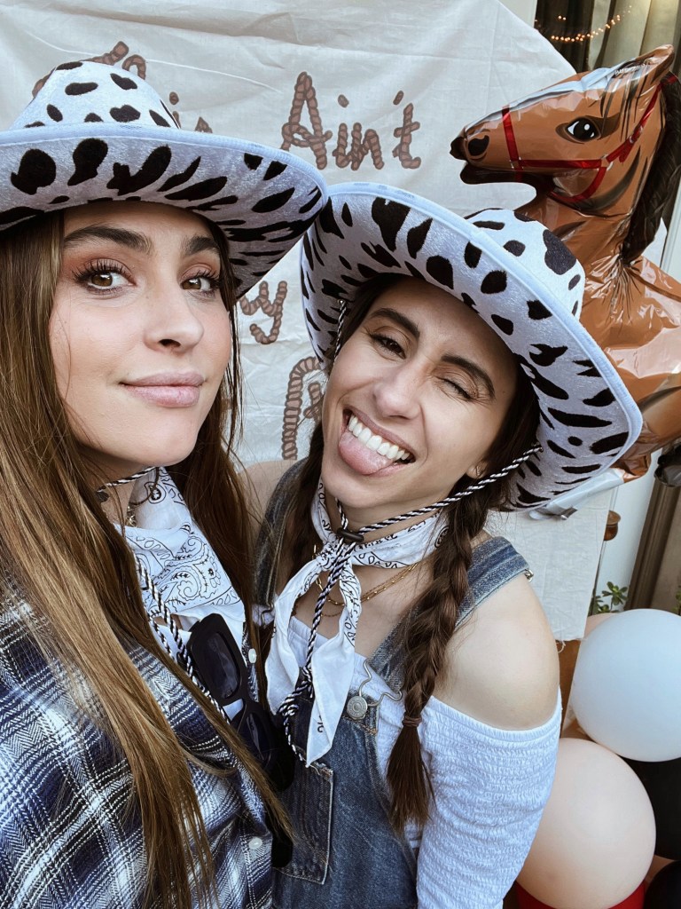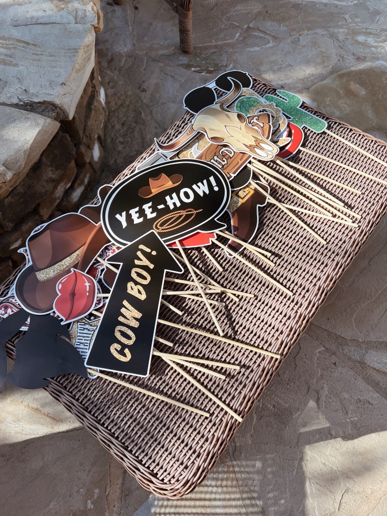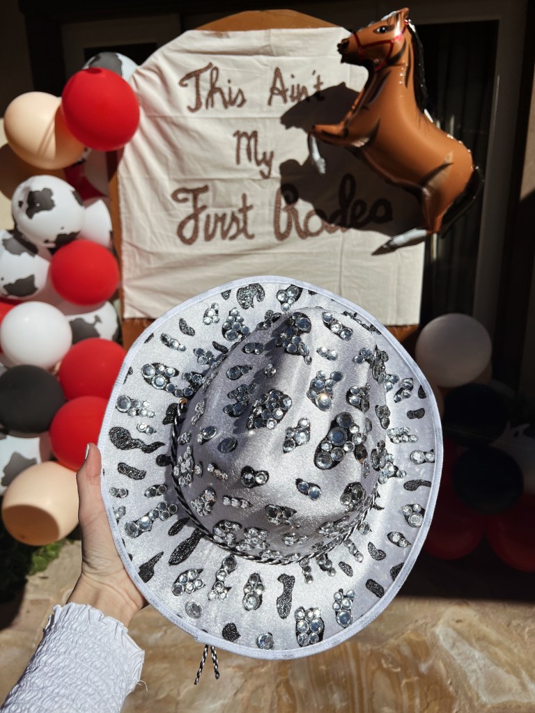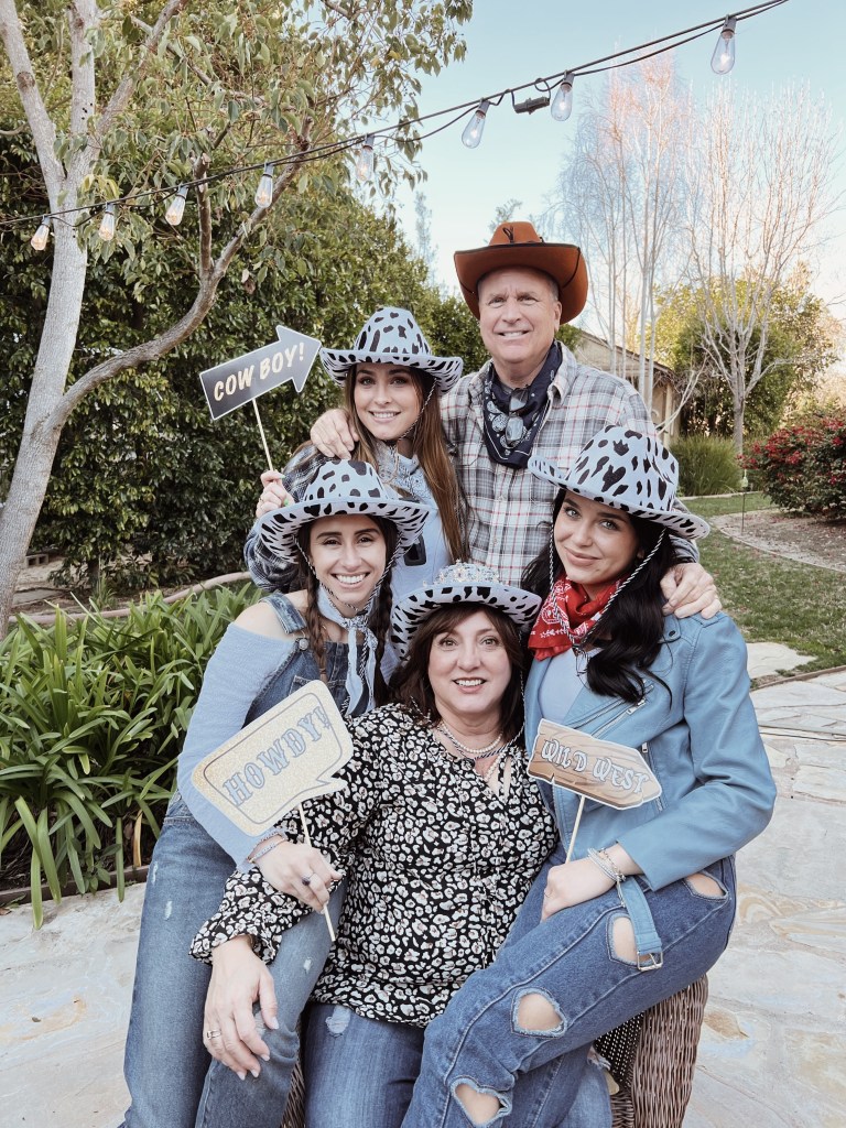 + cowboy hats : I asked everyone to dress up in their best western gear for the event and ordered these for my mom, my sister, my niece, and I to wear. I bought rhinestones from Michael’s and bedazzled my mom’s to make it a little extra special!
