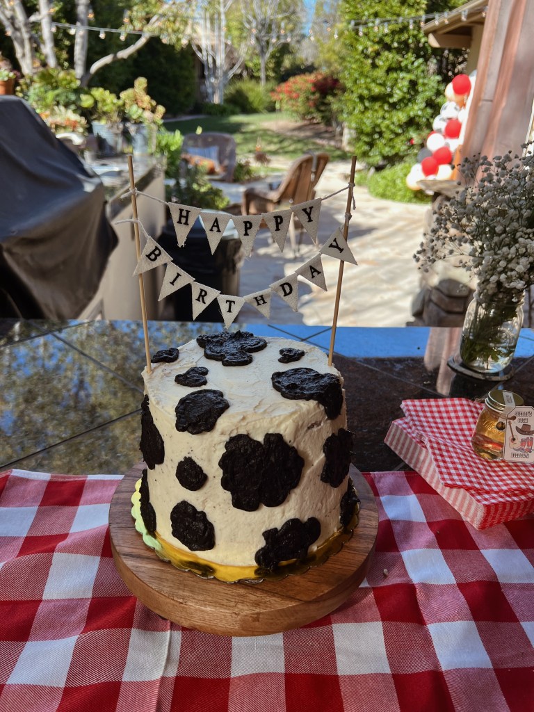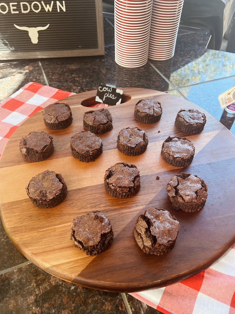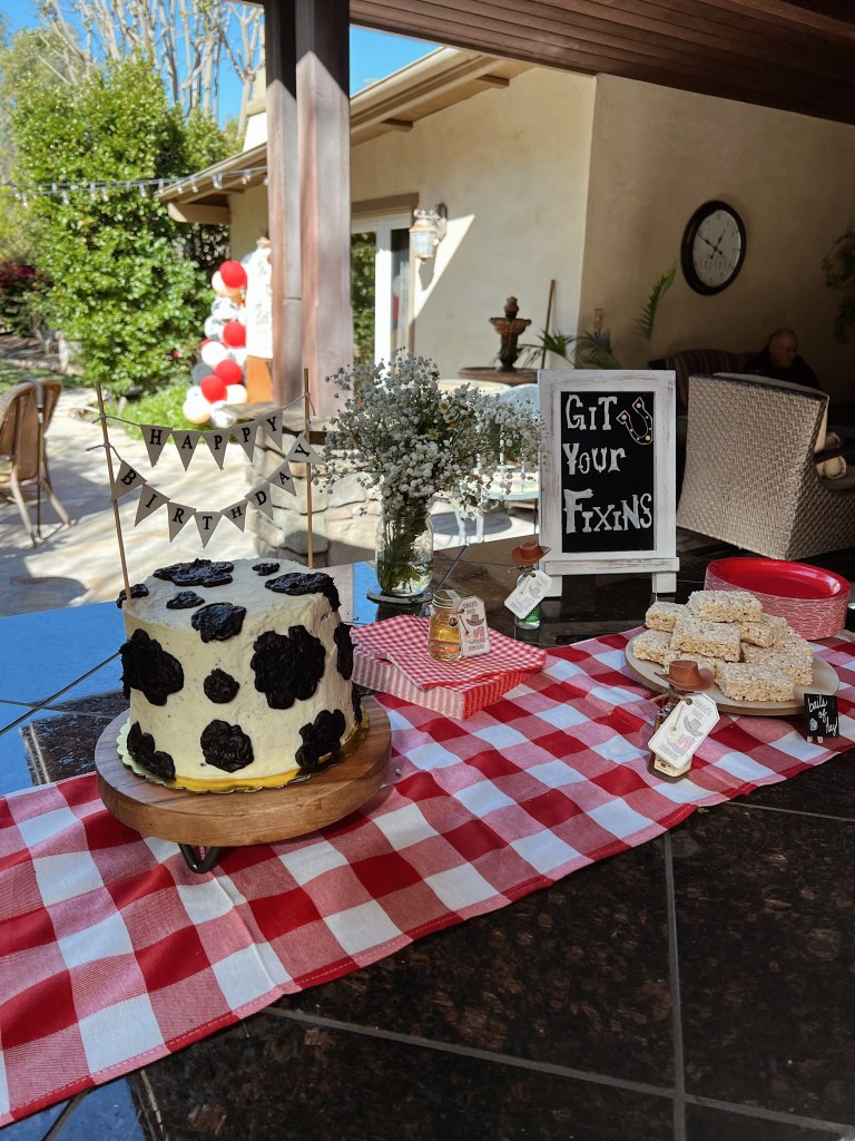 + desserts : as with every party I throw, my best friend made all the desserts- “cow pies” are chocolate brownies and “bails of hay” are rice krispies! The cow print chocolate cake came out so cute!