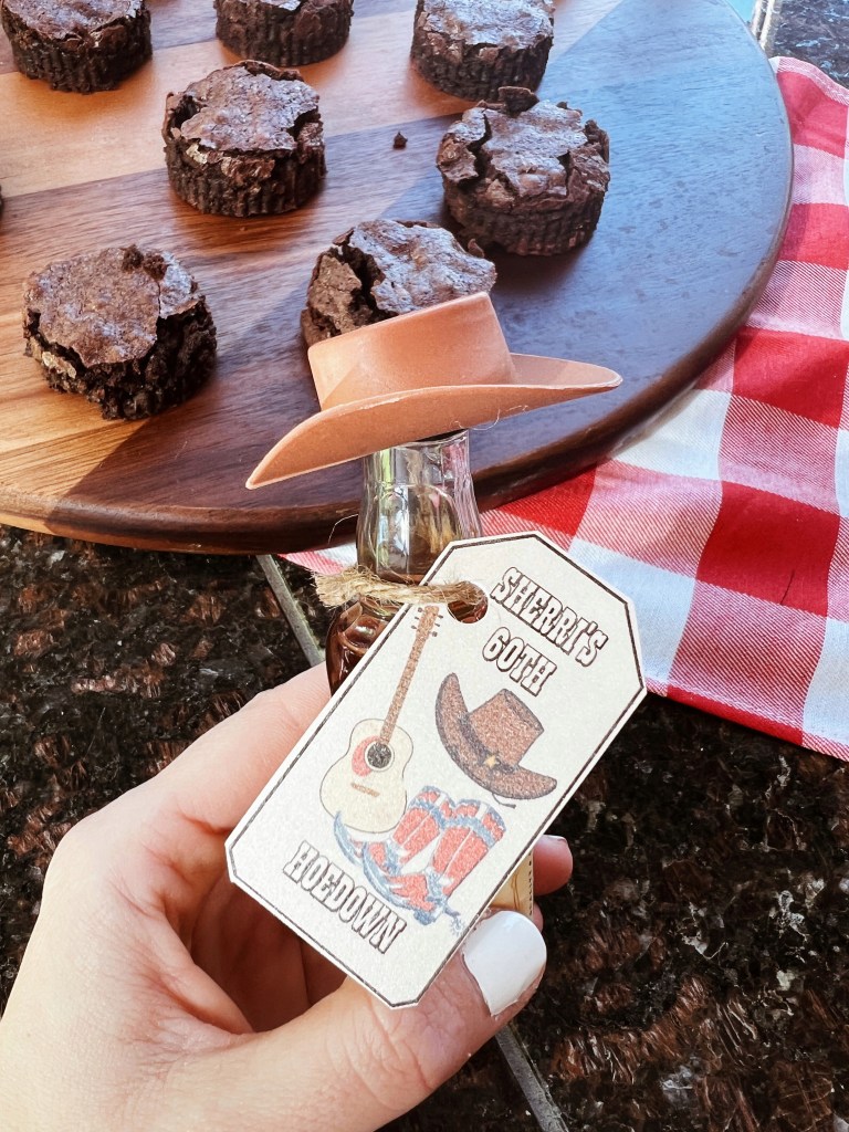 + shooter party favors: we filled the table, and the dining table with cute little shooters which I custom made labels for and ordered mini cowboy hats to fit on top! Linked here!