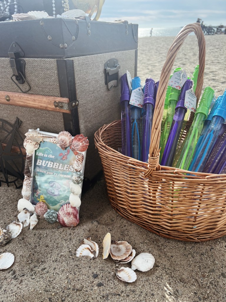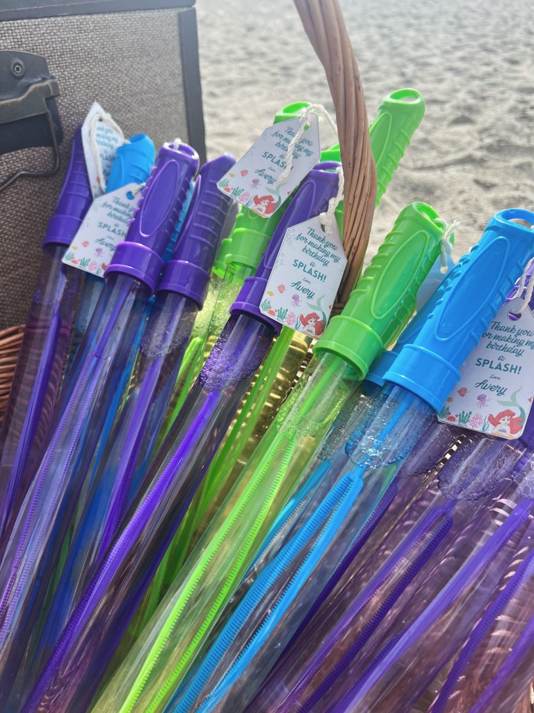 + as party favors (to add to the kinetic sand I bought), I bought a bunch of fun bubble wands and made custom gift tags that I tied on to each one. I also set up a bubble machine on the treasure chest so that bubbles would constantly be flowing throughout the grotto (linking below).