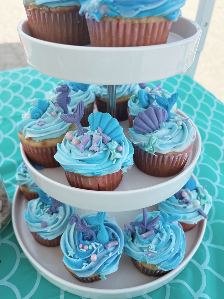 + I honestly cannot take credit for any of this other than making the little labels for each of the desserts. My BFF and Avery’s Godmother made everything herself and came up with all the ideas for the dessert table. I only asked for a sandcastle cake and dinglehopper cake pops, and she went all out and came up with everything else. I will link what I know she bought and can actually link below! She used mason jars and tied fish net around them to hold some of the treats and then also ordered fish bowls to hold fish gummies (will link below!)