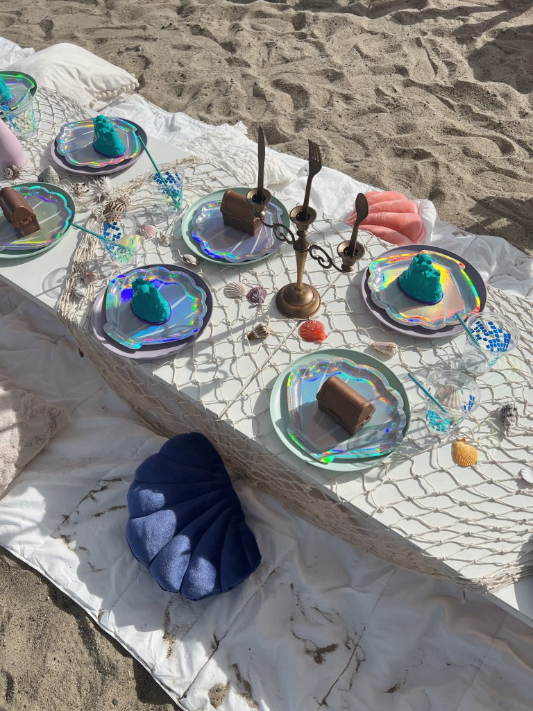 - kinetic sand party favors : mermaid version for the girls, treasure chests for the boys! we placed these on top of each plate for the kiddos.