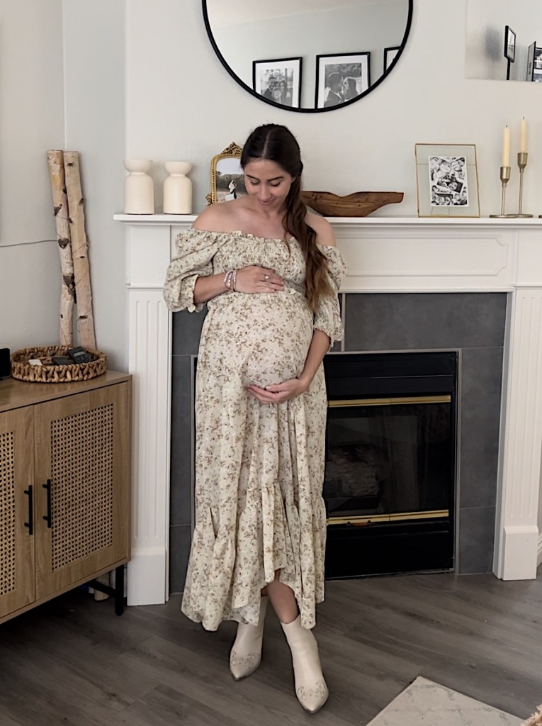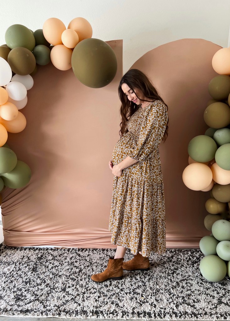 Next, let’s talk about my baby shower look! This dress was so comfortable and HAD POCKETS! That’s a win-win for me! I loved the detail in the floral pattern, I chose to wear it for the baby shower because I thought it went well with our cowboy/western theme and I loved the fact that it was brown with flowers that had blue, purple, and pink in them- a nod to baby boy on the way and then a nod to our beautiful princess as well!