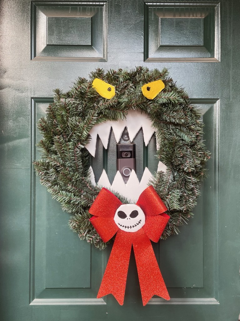 + wreath- bought a plain wreath at Hobby Lobby during Christmas time and then bought thick foam board at Michael’s, cut the teeth and eyes out, painted the eyes and then glued them to the wreath! Bought the red bow at Hobby Lobby as well and then with the extra foam board, painted the little Jack face and then glued it over the center of the bow.