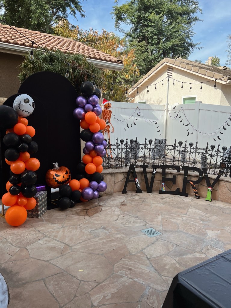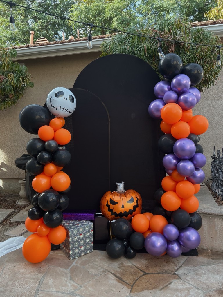 + balloon garland : the exact one I bought came with the black, purple, and Jack face balloons, along with silver which I didn’t use- the set I bought is sold out, but linking some similar Jack balloons! You could also search balloons of the colors separately!