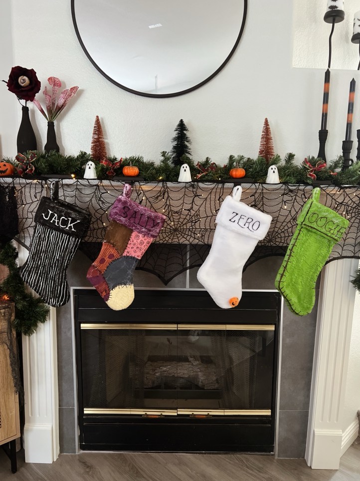 + okay the fireplace was really my pride and joy. I bought the spiderweb garland at Michaels’s, a plain wreath garland from Hobby Lobby, and then I bought 4 plain white stockings from Hobby Lobby and painted them to the theme of each character! Then my husband (who is now a pro at the Nightmare Before Christmas font, painted on the names!) mini pumpkin and ghost candles came from Home Goods, the black vases are actually sparkling water glasses that I painted matte black and then the spooky floral fillers are from Michael’s (during Halloween), Halloween candlesticks are also Home Goods, as are the black candlestick holders. mini trees are from Target (yearsss ago). Little tip when planning decorations- I always think ahead and make sure that I know if I need battery operated things vs plug ins. All the lights that I had purchased were all battery operated. I hate visible cords, so if I don’t think I can hide the cord or if it will require an extension cord to reach the outlet, it’s not happening and I find a battery operated option instead!
