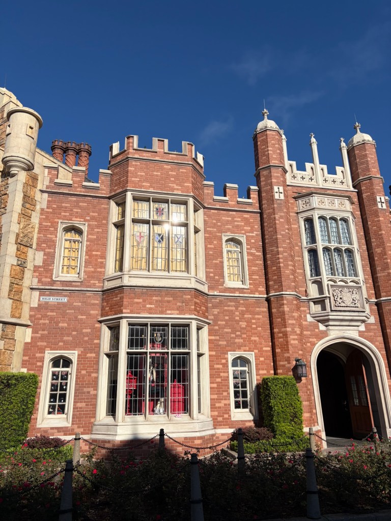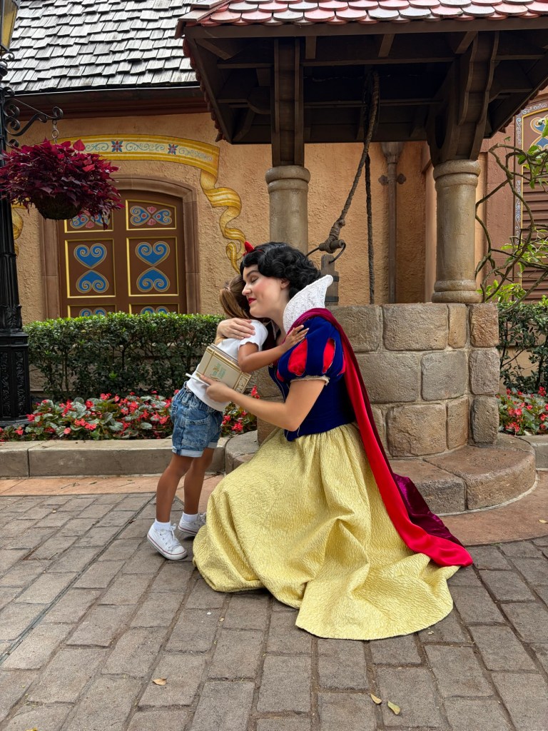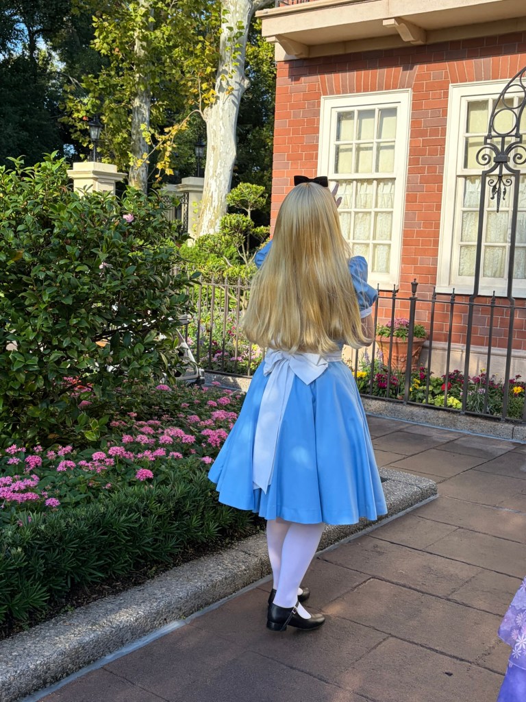 After getting off Remy’s, on our way to the Joffrey Coffee Cart for my chai tea and some donuts for us and the kids, we saw Belle walking around France! My daughter got to hold hands and stroll around with her for a bit which was really cute! Then we made our way into England and met Alice in Wonderland playing hide and seek with the Chesire Cat! The character interactions were really special here and I loved how interactive and free moving the characters were!