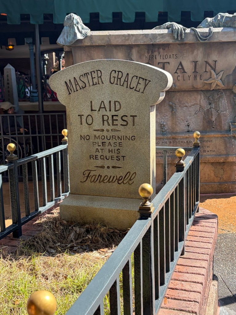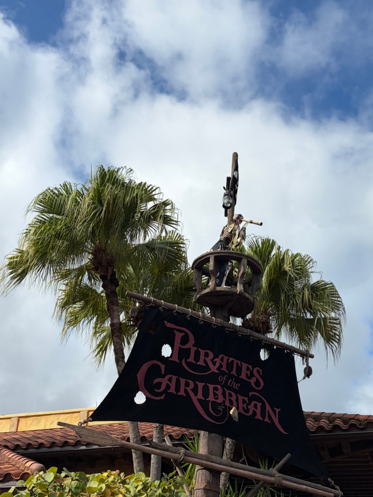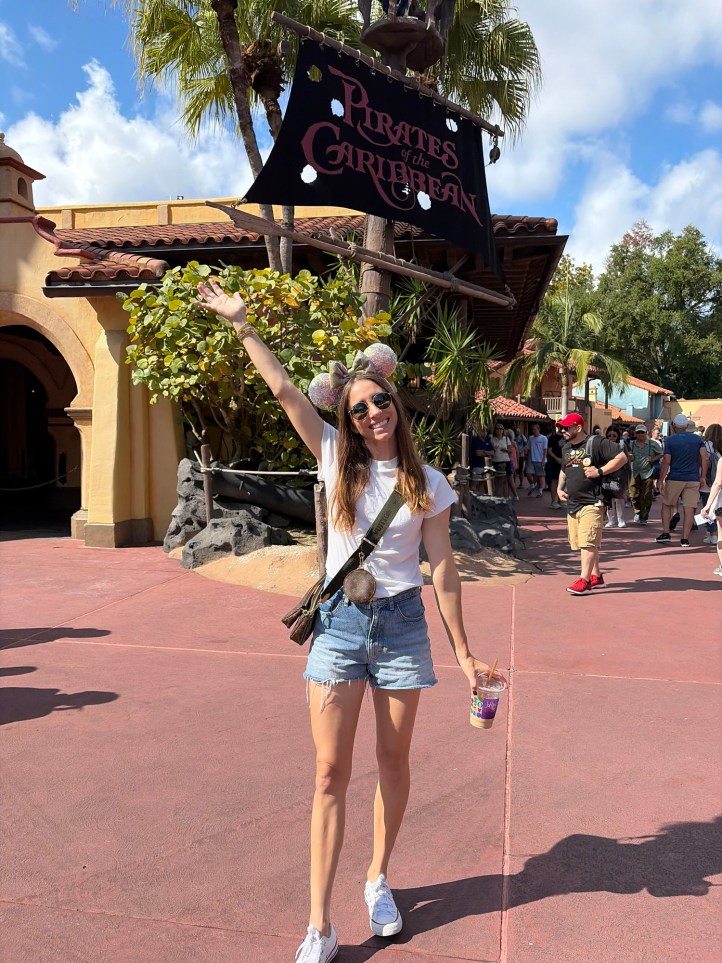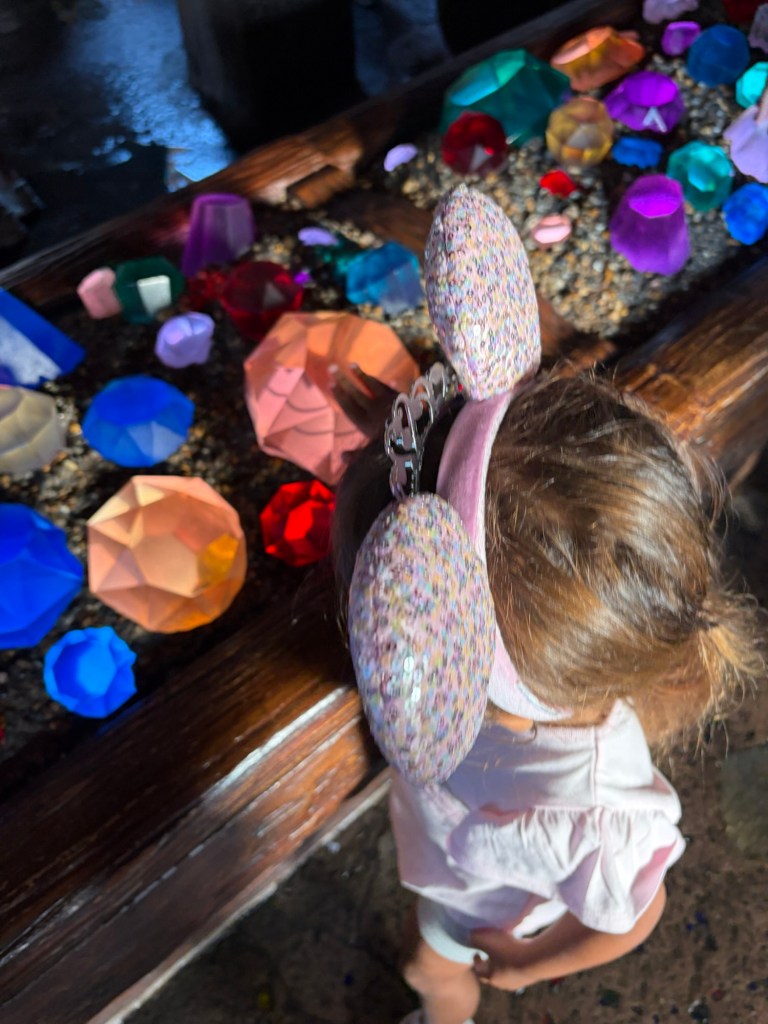 After embarking from meeting Ariel, we went TomorrowLand and watched the Monster’s Inc Laugh Floor show, which was super cute and new to us! Next, it was straight to PIRATES OF THE CARIBBEAN! Avery actually strongly dislikes this ride back home (which is a bummer because it’s my favorite ride), but she shocked me and actually wanted to go on it for me, which was so sweet! Similar to mermaid, I was so impressed with the line itself (which we walked straight through without stopping until we boarded the ride), but the line queue was literally a shipwreck that you walk through to get to your boat. Absolutely loved.