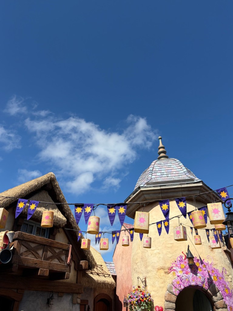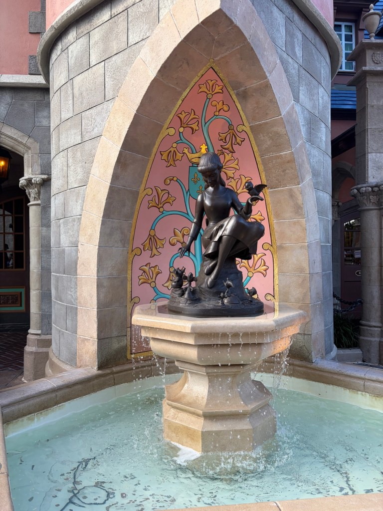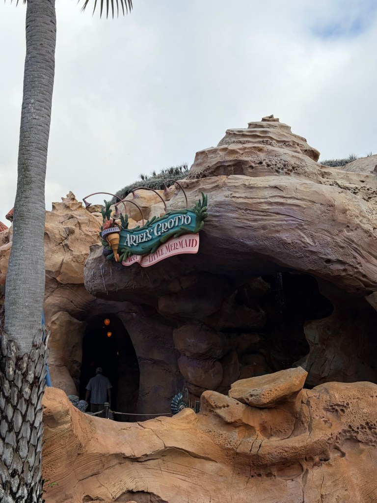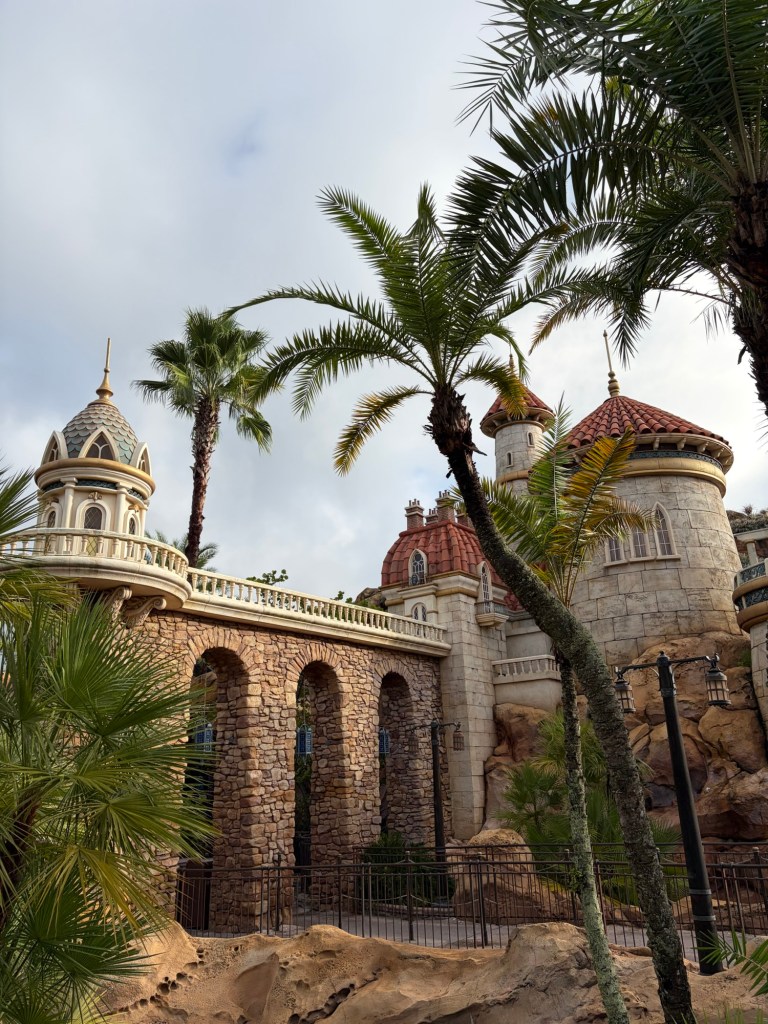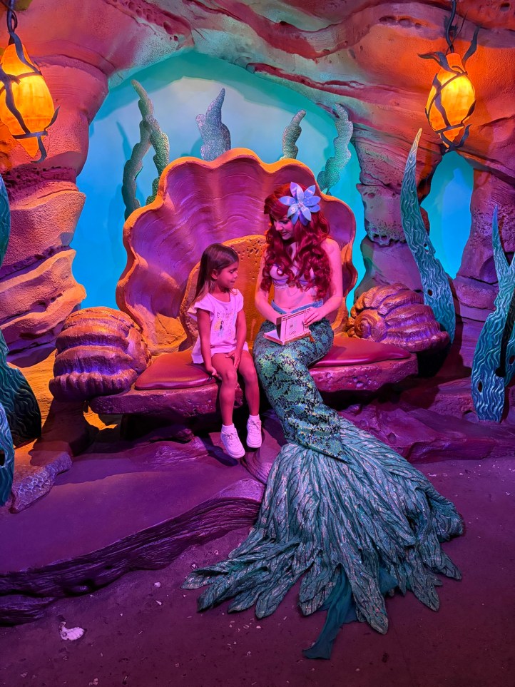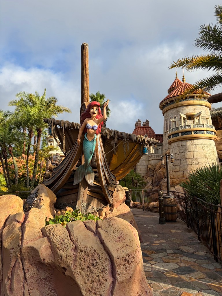 Outside of the ride, you could then enter a separate line to walk into Ariel’s Grotto to meet her! This was super cool because they allow you to meet her in her mermaid form, which Disneyland no longer does. Avery was so excited and couldn’t stop staring at her glittering tail! Across the way, they had Eric’s Village Market full of little snacks and drinks, but just the whole area made you feel like you were in the movie and just right outside Eric’s castle!