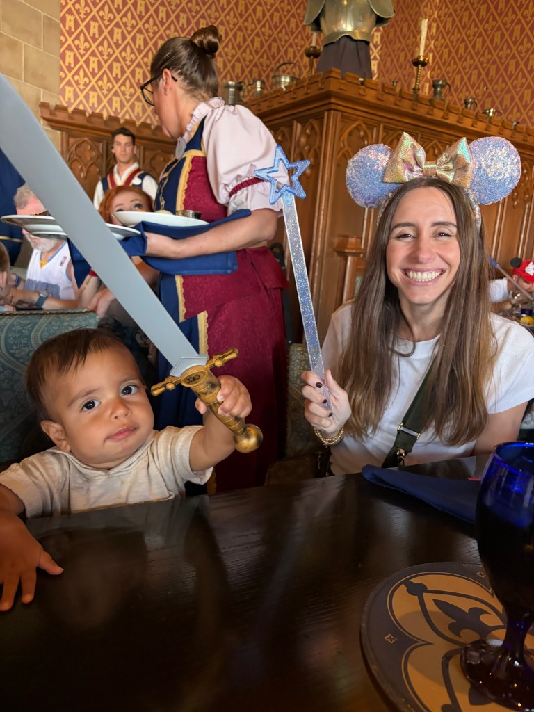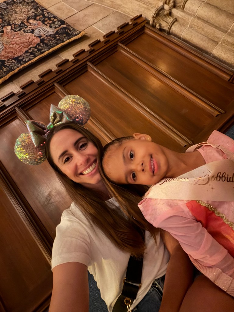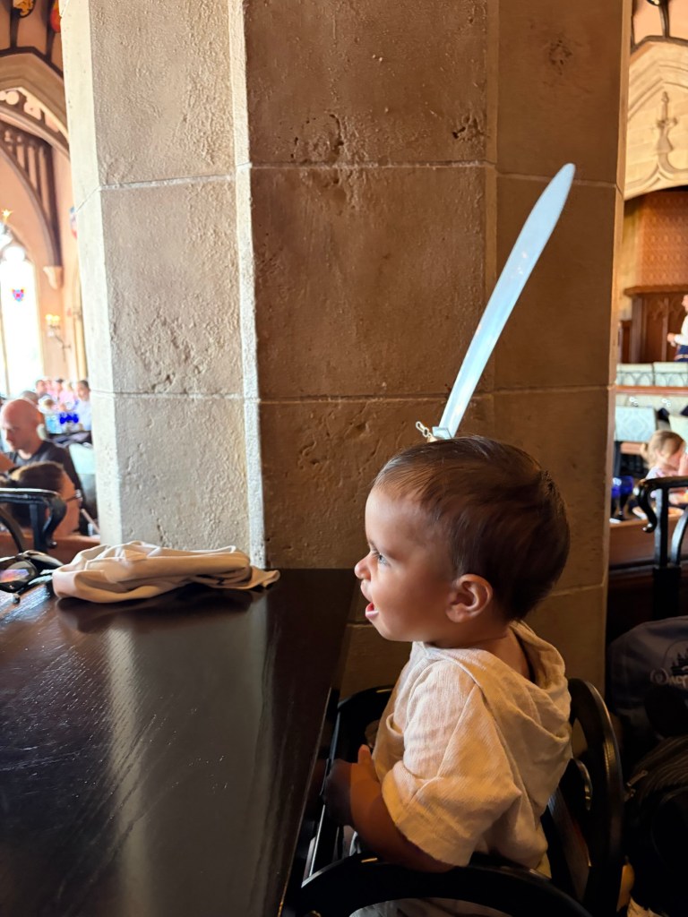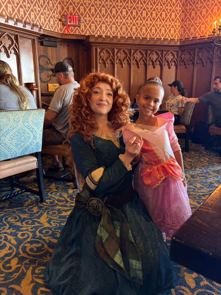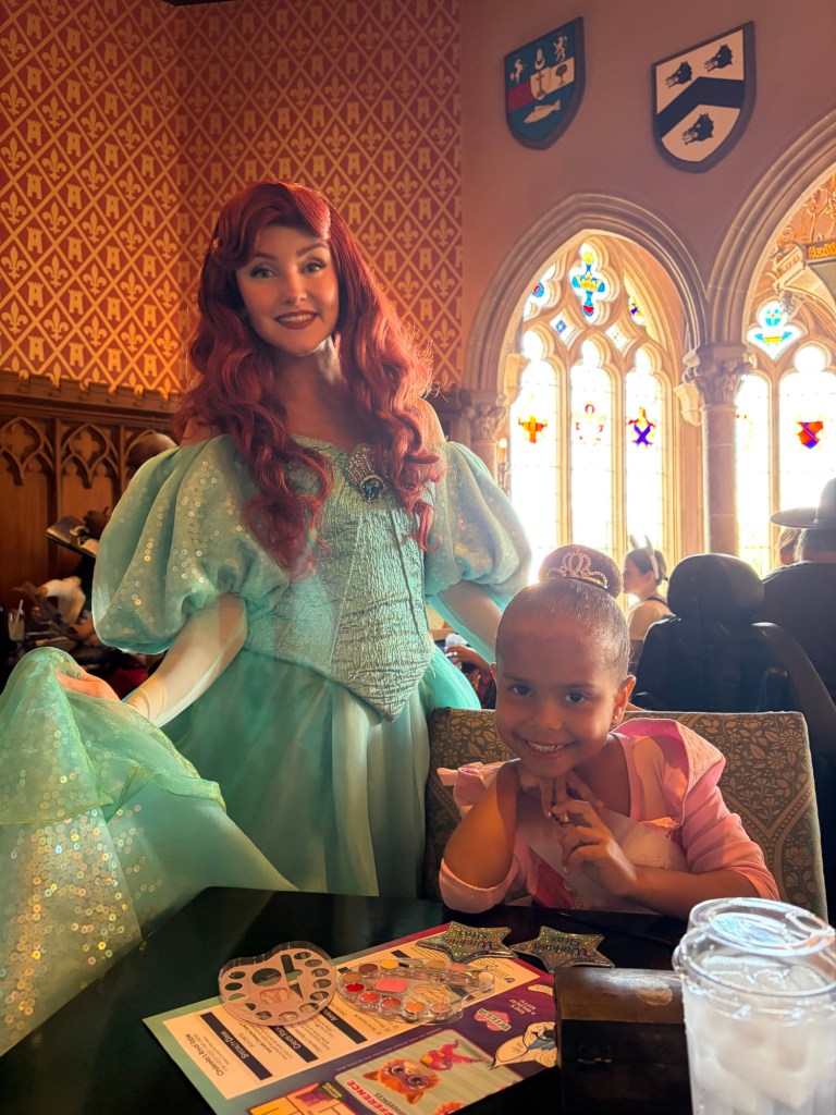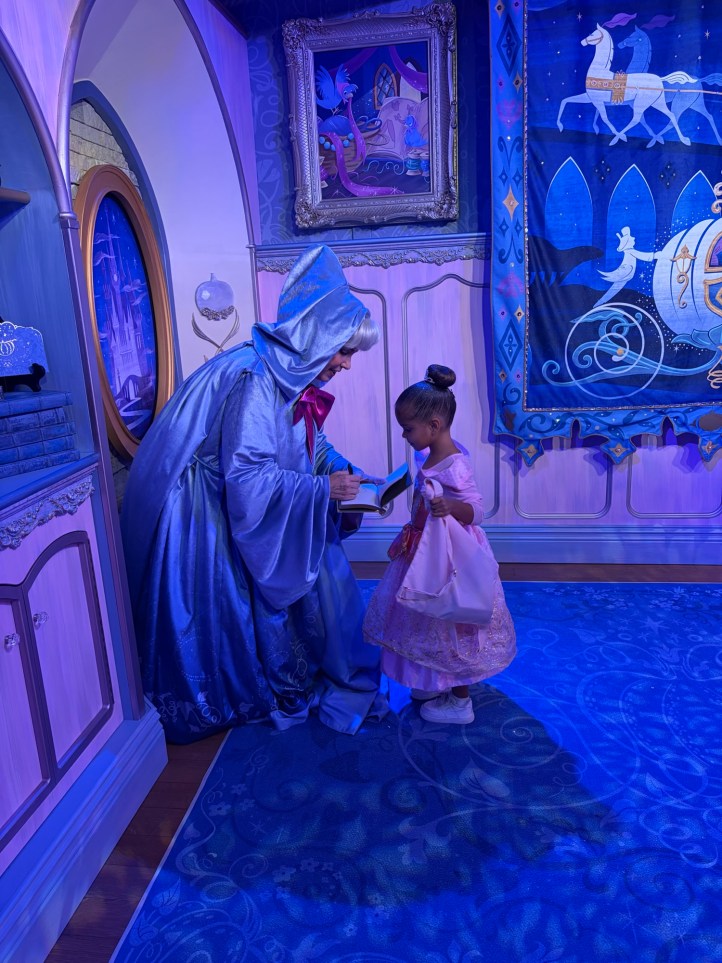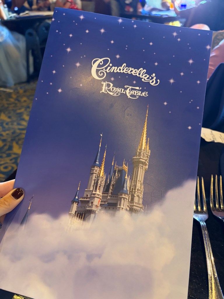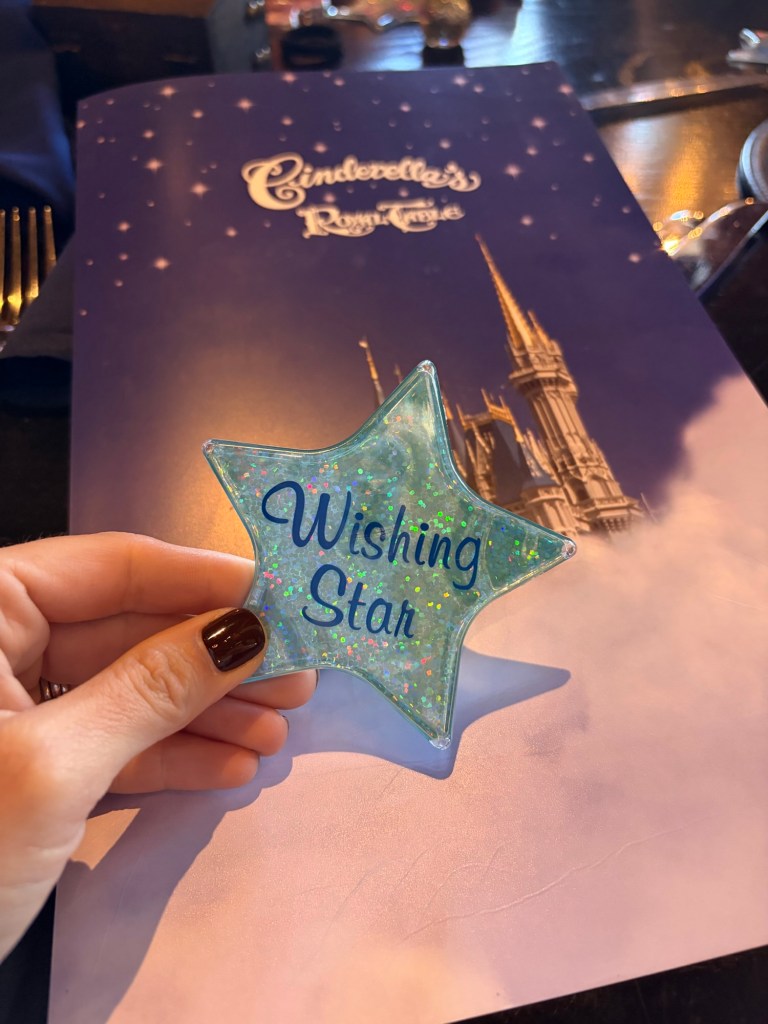 Lunch was truly unbelievable. It is a 4 course meal and while you’re eating, different princesses are walking around and will come to your table to interact which was hands down the most magical part of the day. Avery was in awe the entire time. Entering the castle, everyone who dines there gets a portrait with Cinderella downstairs, and then once you’re upstairs and seated, there are 4 princesses that rotate throughout the meal. While we were there, the princesses featured were Ariel (in human form), Merida, Aurora, and Jasmine. We bought Avery a little princess journal in EPCOT that she had for the princesses to sign, which made her so happy and was actually our first time doing an autograph book for her. I recommend doing it at Magic Kingdom if your child loves character interactions! During your meal, they pass out little plastic star souvenirs to everyone seated at a table and then they have a “wish ceremony” where the lights go off/on and they play music and everyone is told to hold their star to their hearts, make a wish, and then hold the star up to the sky. It’s so cute and special for the kids! Avery now has her wishing star sitting on her bookshelf in her room.