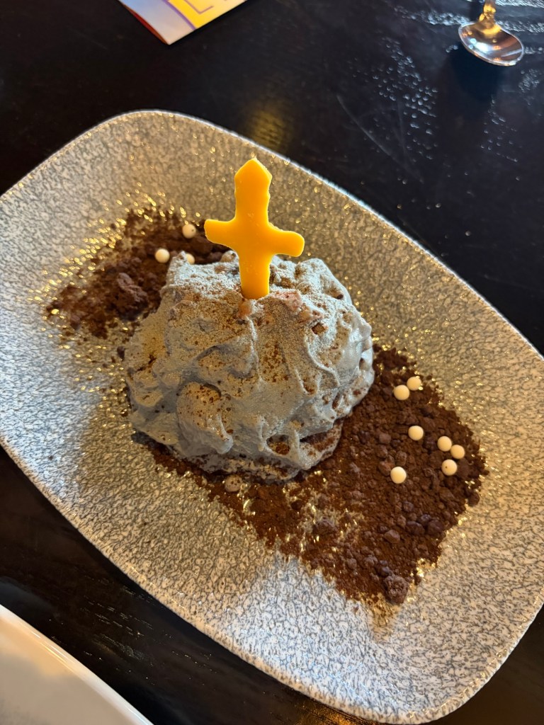 + Dessert : so when we went to Disney Springs on our first night for dinner, we walked by a place called Gideon’s BakeHouse that had a line around the entire building and then some, and also had “bouncers” in the front only letting a certain number of people in at a time. We were immediately intrigued so my husband asked one of these “bouncers” what the place was and they showed us a menu and basically told us the deal. It was a specialty cookie and cake bakery that had a waitlist and typically sells out every night. For that night, the waitlist was full and you couldn’t even get in line unless you were already confirmed for that date. So we joined the waitlist for two nights from then and make it on for after our Magic Kingdom day. If you like cookies, these are AMAZING!! And the entire experience of getting into the bakehouse is pretty unique, although I will say the inside is kinda creepy lol. Linking the store for you to take a look!