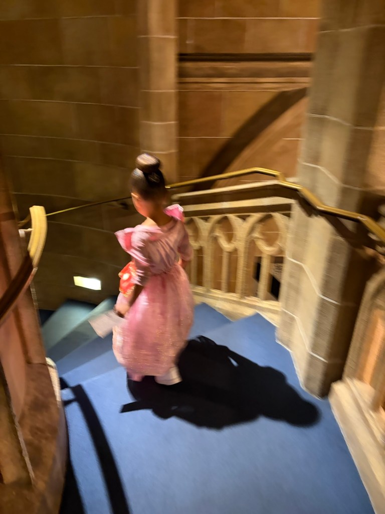 Next we ventured back to FantasyLand for It’s a Small World and then the Prince Charming Carousel. After that, it was getting close to our lunch reservation and Joey decided that he wanted to surprise Avery with a Bippity Boppity Boutique makeover before her royal dining plans. You usually need to have a reservation for this experience, so I recommend getting one! We got lucky and they were able to squeeze Avery in for a makeover. We actually brought a dress from home, but you can also purchase princess dresses inside as well. She got her makeup, hair, and nails done and then we went straight to meet Cinderella for a photo shoot before walking the winding staircase to the top of the castle for lunch!