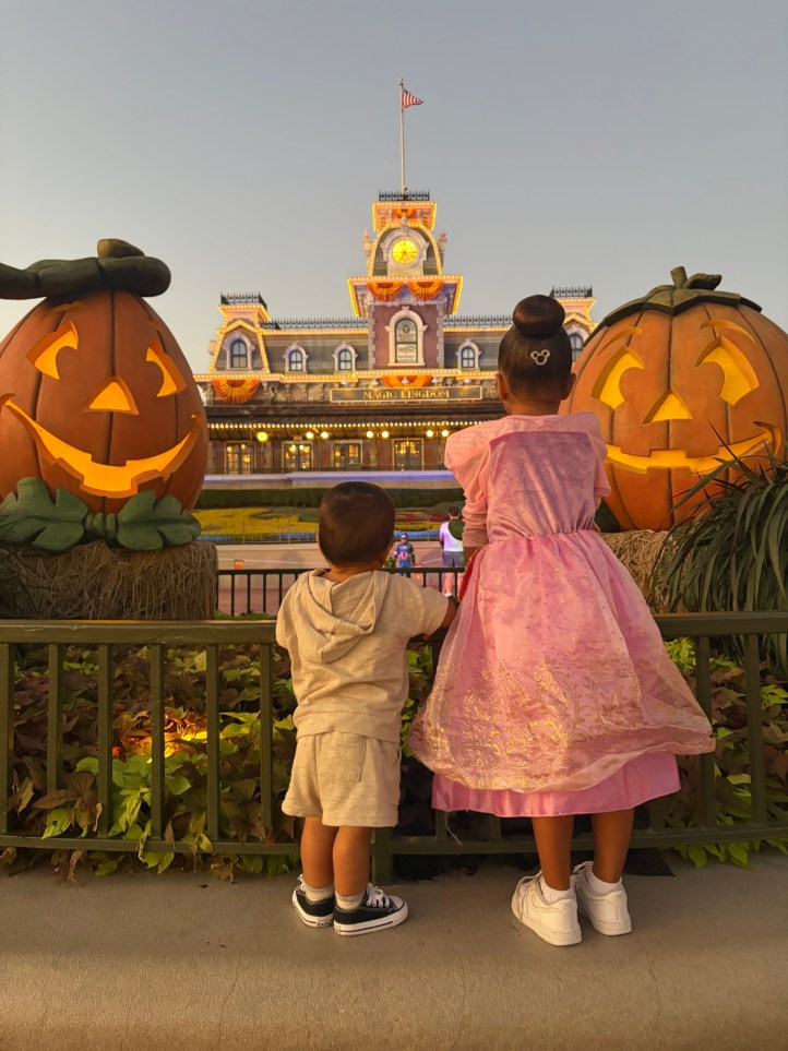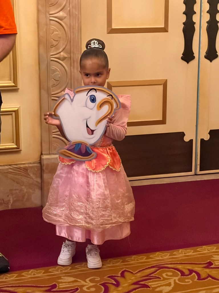 On our Magic Kingdom day, the park actually closed at 6 pm for Mickey’s Not-So-Scary Halloween party, which we did not buy tickets too. We left Cinderella’s Royal Table at around 4:30 pm and walked to Belle’s cottage for the Enchanted Tales with Belle show, an interactive show with Princess Belle where little ones get to act out and play characters from the story. This was a blast! Avery was picked to play Chip the teacup and then also, as a surprise, was also THE BEAST! It had everyone in the audience laughing seeing this little girl in her princess gown and hair playing the beast! We had no idea what we were in for when we got in line but walked away so happy we did it and that our girl had that experience acting on stage with Belle!