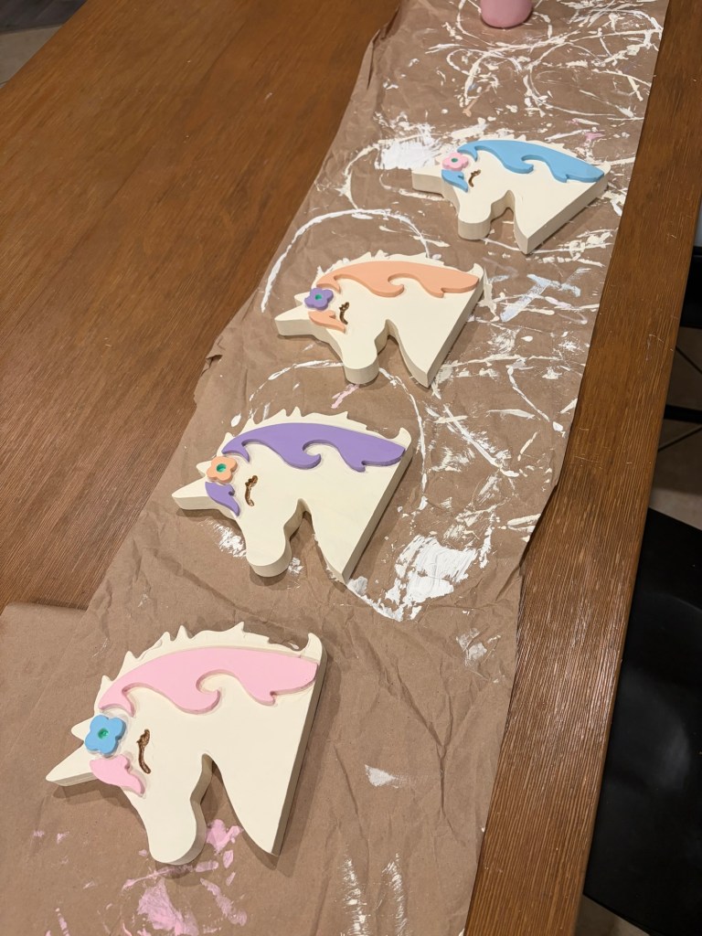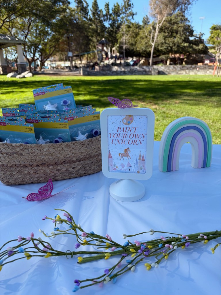 I’m a little crazy, but I like having a little craft table for the kids to do during the party or to take home extra little things that they can do when they get home. For the craft table, I bought little ceramic diy unicorn painting kits from Hobby Lobby (also bought Spring 2024 lol) and then I also came across this little pegasus/unicorn paper airplane craft that I had to grab too!