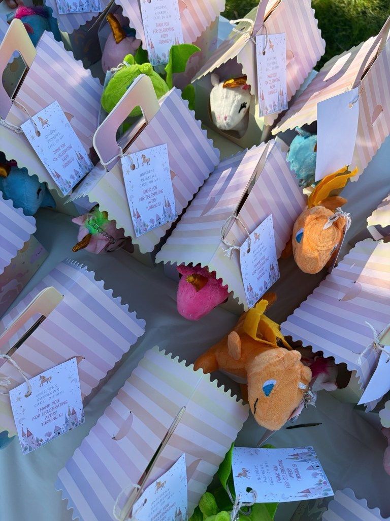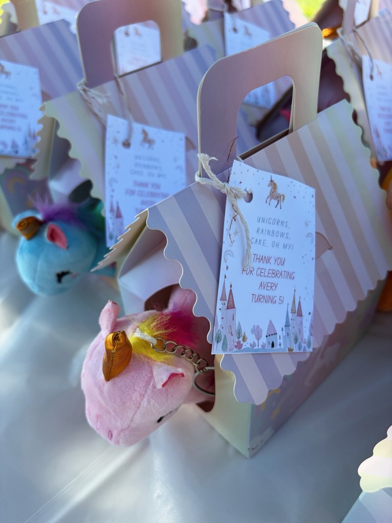 + Adopt a Unicorn Party Favor : this came with all the unicorn plush keychains, the boxes, and actually a sign. I’m a little OCD and like everything to match my vibe, so I made my own sign instead of using theirs.
