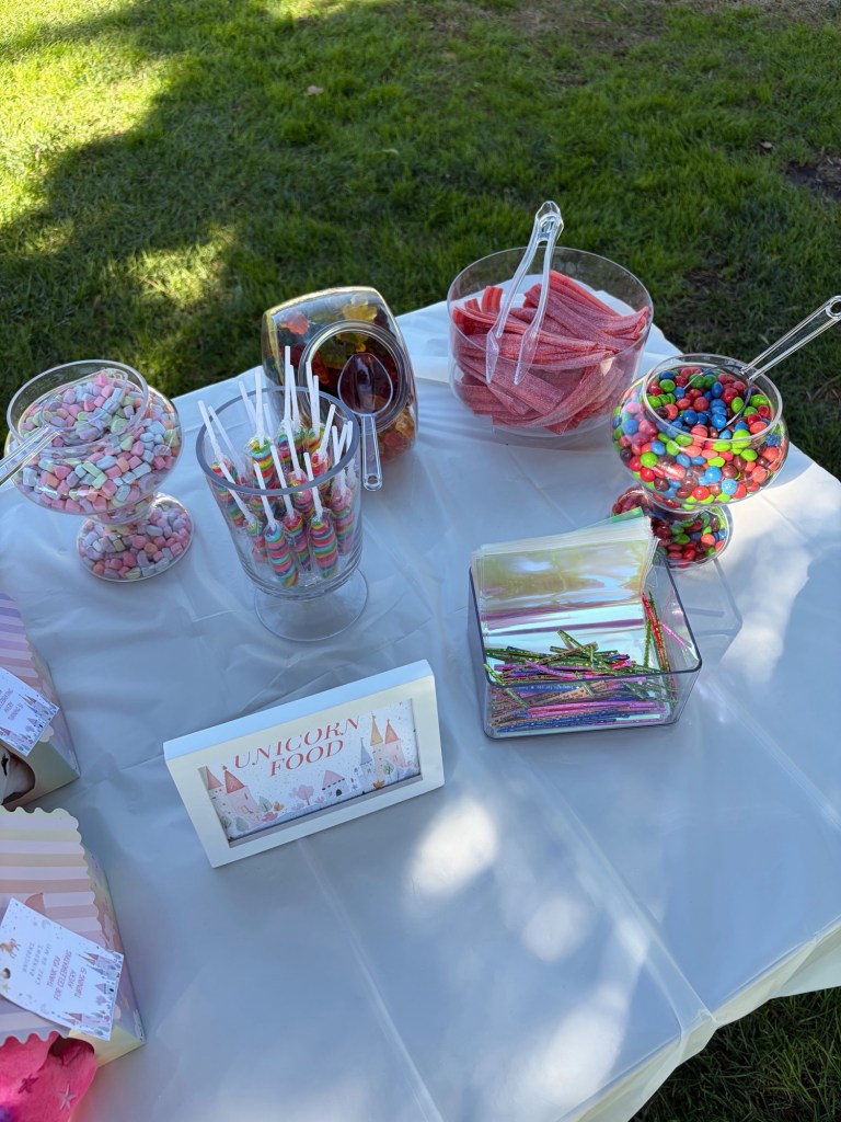 In addition to the little adopt a unicorn set up, I had a candy bar (unicorn food) station set up with little baggies to fill up with candy! This was so fun. The candy dishes I bought at Michael’s and ended up getting glass ones because they were actually cheaper than the plastic versions!! So I’ll definitely be using these again! It’s a lot to link but if you click this link (my LTK post), it has all the exact Michael’s dishes that I bought in addition to everything else from this table lol. But I’ll link the other things below for convenience! The UNICORN FOOD sign I also made on Canva, printed, and framed. The white frames I bought from Target for a party last year and already had on hand!
