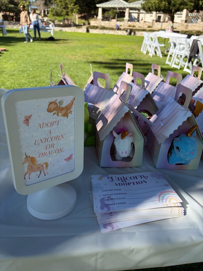 For my “goodie bags” I had little adopt a unicorn/dragon boxes set up for each kid (or adult) to take home. The sign I made on Canva and I also made the custom gift tags for each box which matched what the invitation for her party looked like.