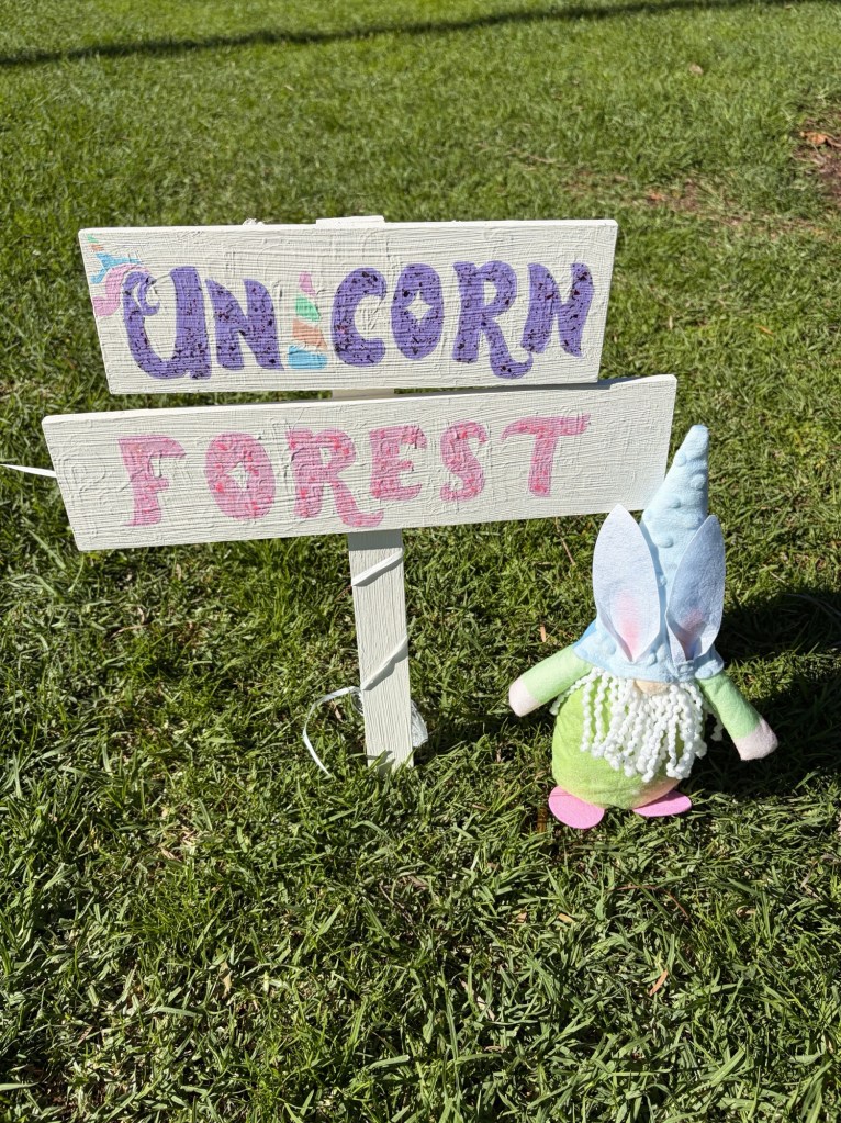 + the unicorn forest sign I painted myself and it’s actually been used for multiple parties at this point (which you can probably tell if you look hard enough lol), I just paint over whatever the previous sign was.