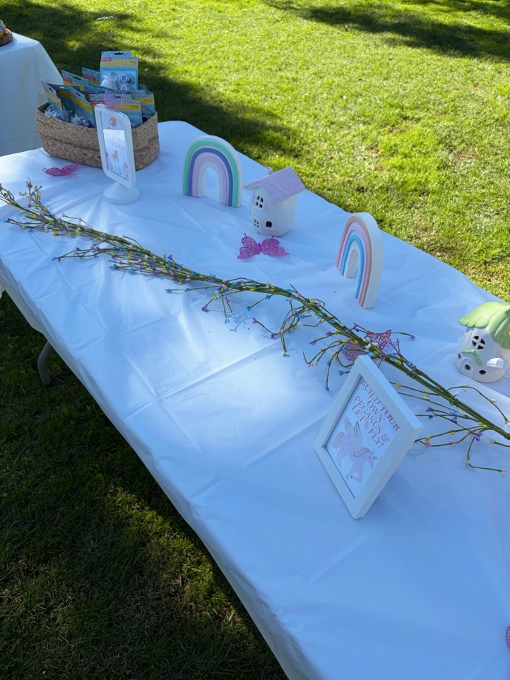 Our color scheme was pastel rainbow because that neon shit gives me a headache (kidding, kind of). My daughter’s favorite colors are pink, purple, and blue so that was a lot of the main color scheme and she absolutely loved it. I’ll post detail shots below and link what I can!