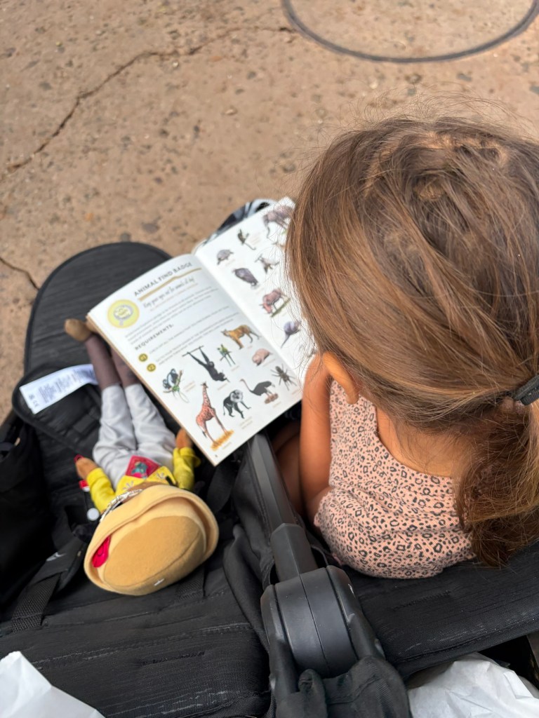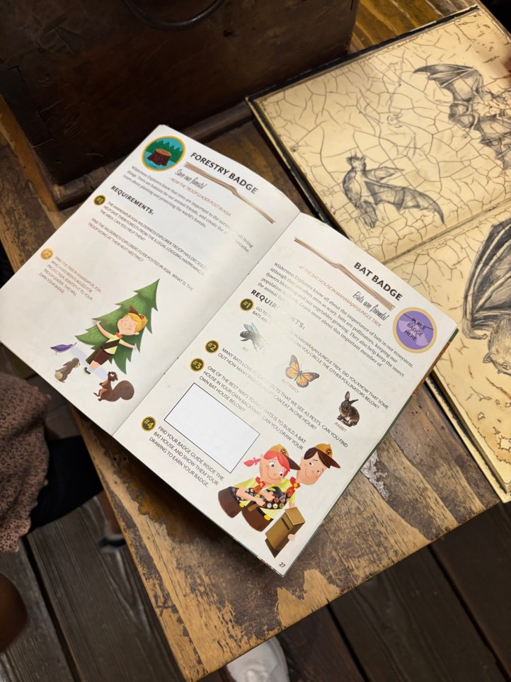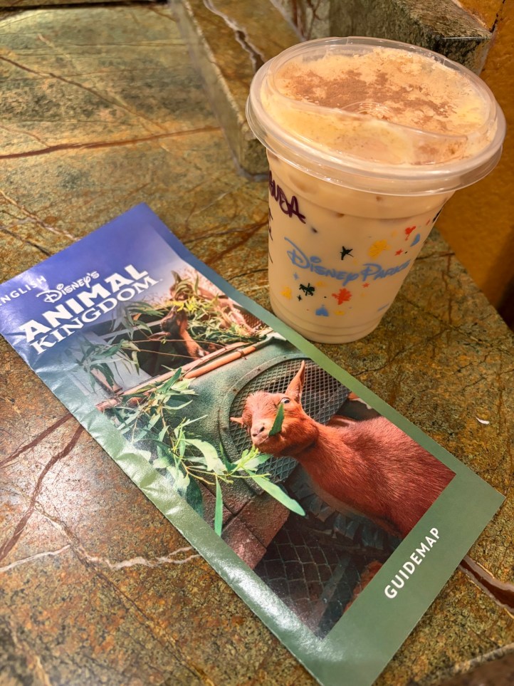 After getting into the park, we stopped in to a Starbucks location in the park for my chai tea and some breakfast sandwiches for the kids. On our way out, we noticed a little stand set up with employees handing out what looked like little pamphlets to kids, so we ventured over there and learned that littles can become a Wilderness Explorer if they complete the booklet of activities throughout the day! We grabbed one and knew it would be a hit after seeing how much our daughter loved the Passport activity at EPCOT. For this one, throughout the park there are tents set up where kids can learn about something related to the planet or animals, and earn “badges” (stickers) in their booklet after they complete an activity or answer a question. It was really fun!