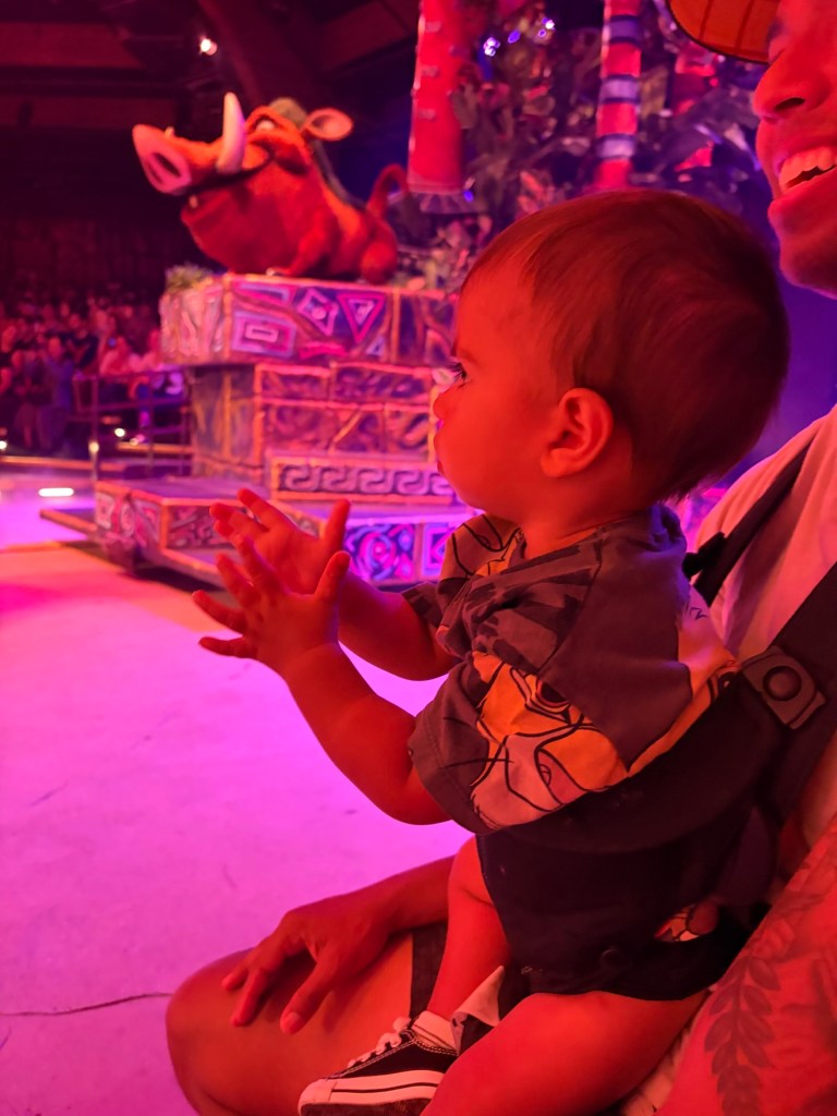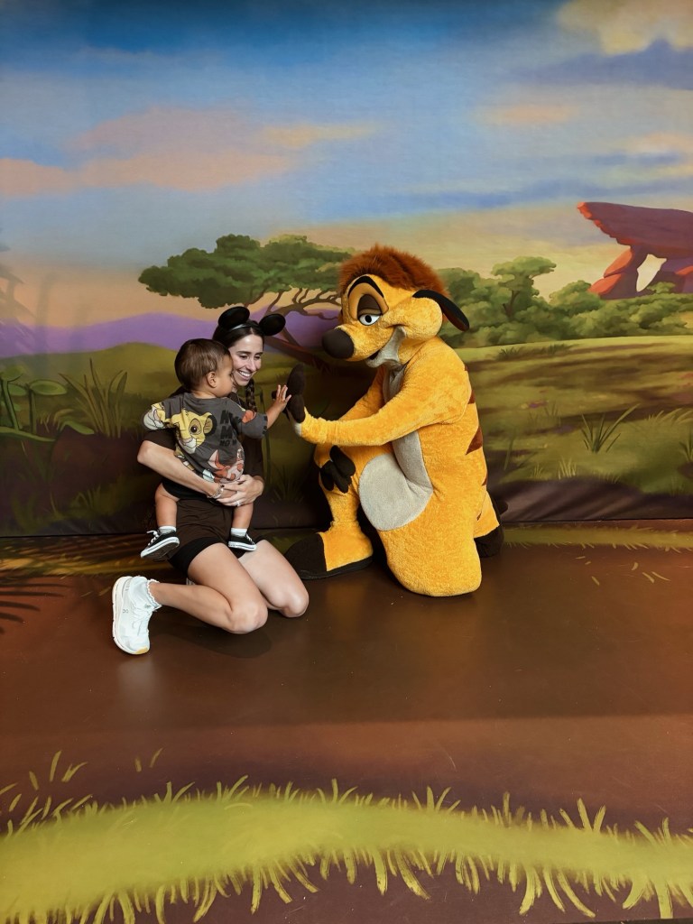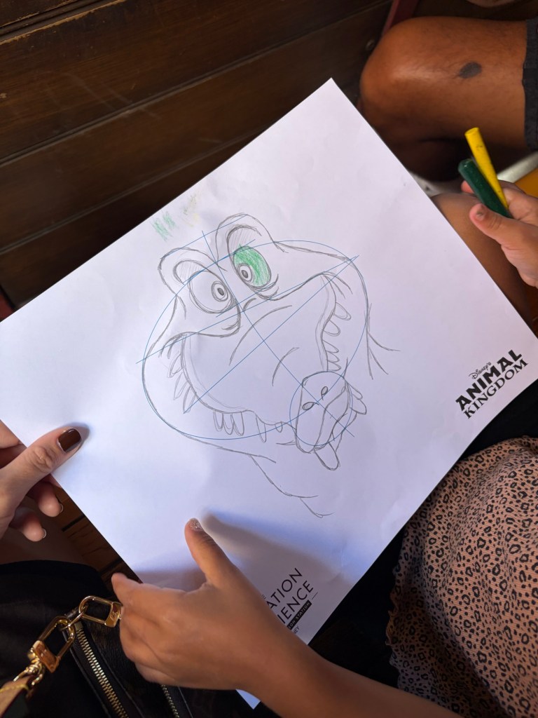 After the safari, we went over to Rafiki’s Planet Watch and Conservation Station, you do have to take a little train ride out to the area, but they give you a behind the scenes look at the caring of the animals and the veterinary areas. You also can do a drawing session where you learn to draw one of Disney’s famous animal characters. We got the crocodile from Peter Pan! There’s also a meet and greet area where kids can meet a character! We met Timon from The Lion King, which was great because during the Lion King show we watched, Jaxson was obsessed with watching Timon and he even came to give him a high five! So it was so cute that he got to meet him for photos!