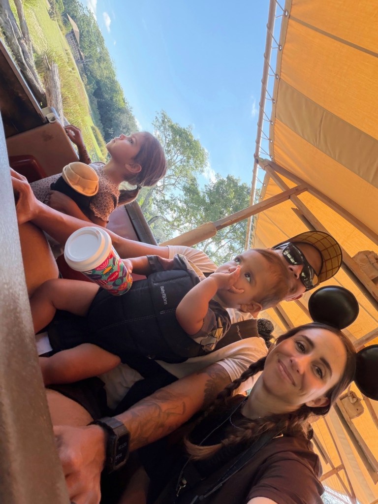 Our first lightening lane was for Kilamanjaro Safari at 11:30 am, so we walked straight to Pandora to get on the Flight of Passage ride in the meantime. When we got there, it had a 25 min wait, so my husband went and got in line while I walked around with the kids eating their breakfast sandwiches. We did rider swap, so once he got off, I was able to walk through the line and get straight on without a wait. Although, if the wait isn’t too bad and you have kids that do meet the height requirement, I’d almost say its worth it to wait and go through the entire line before actually getting on the ride. My husband filmed it and the entire queue was so cool and then there was a whole room where they had it set up like the labs from the Avatar movies- going rider swap or single rider, you bypass this entire area to get on the ride so when it was my turn, I didn’t see any of it!