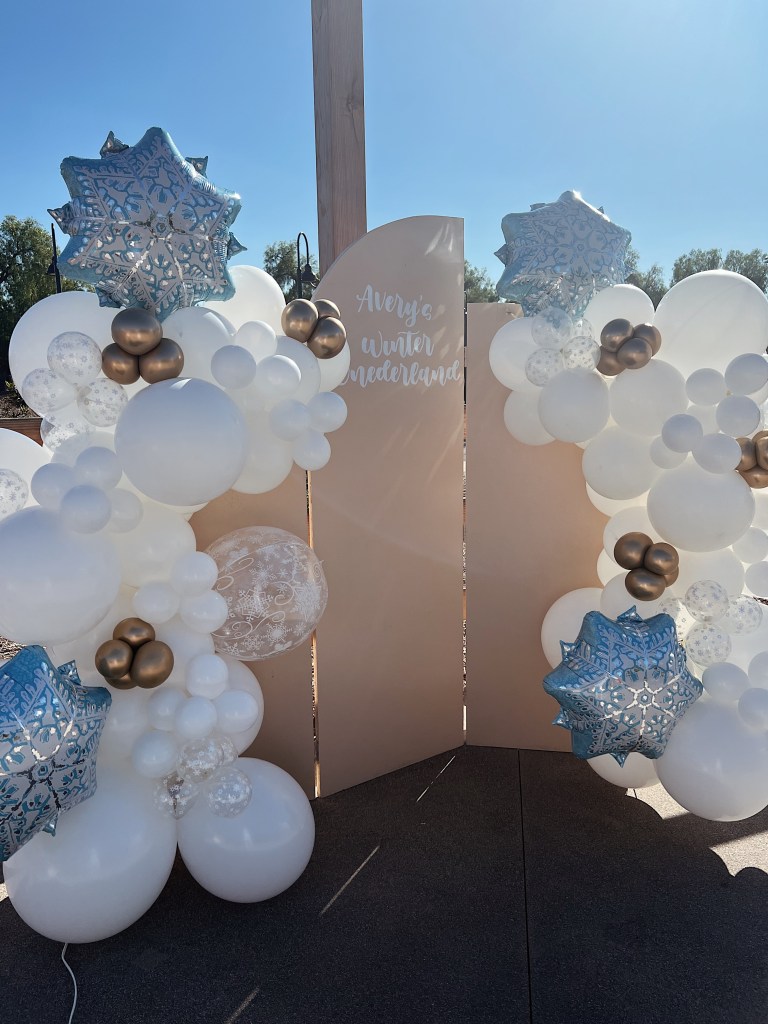 The last and final thing I plan/prep for is the backdrop. We use these golden arches for every party and I usually decide on a backdrop cover color that I like and then from there plan decorative balloon arches and what color balloons to use- pro top: don’t choose a balloon color that matches the backdrop cover (unless of course your going monochromatic), the ones that match the cover get lost and then it looks like your arch has a gap between colors.
