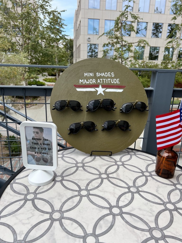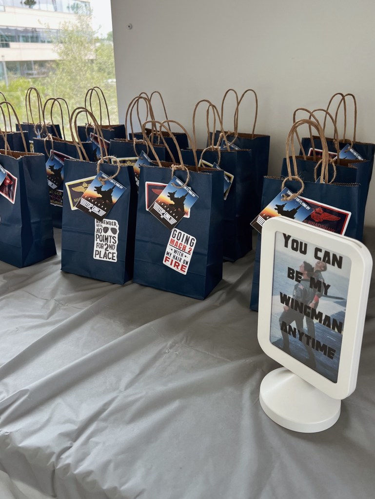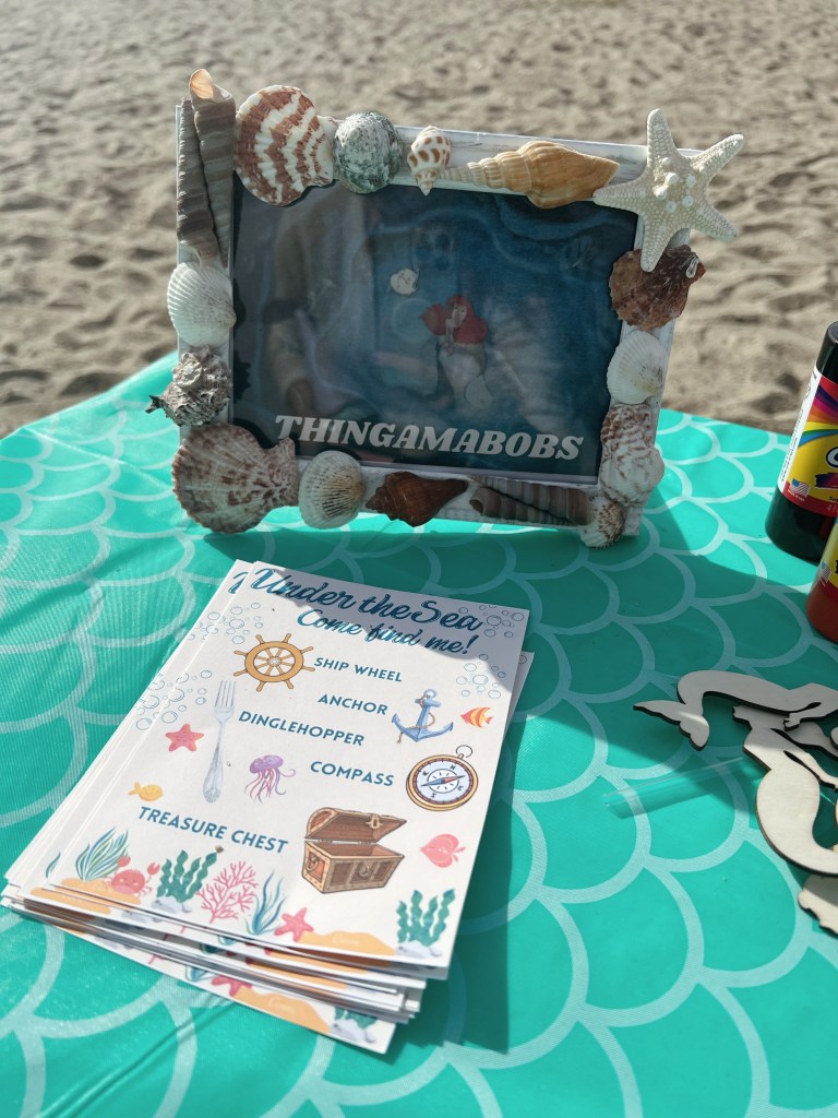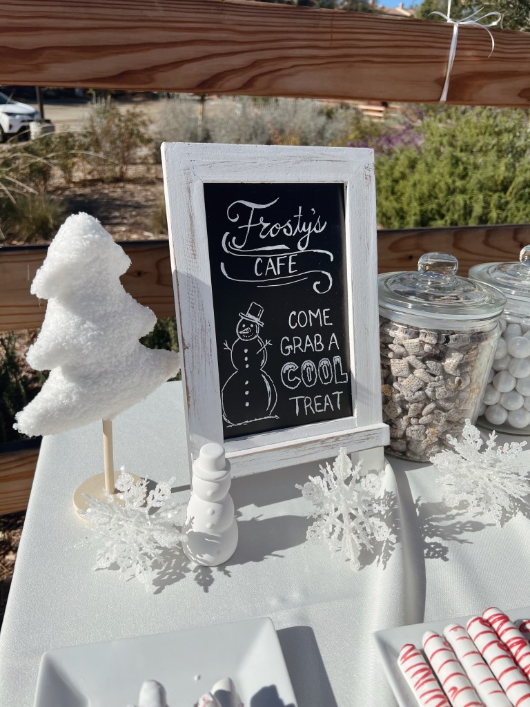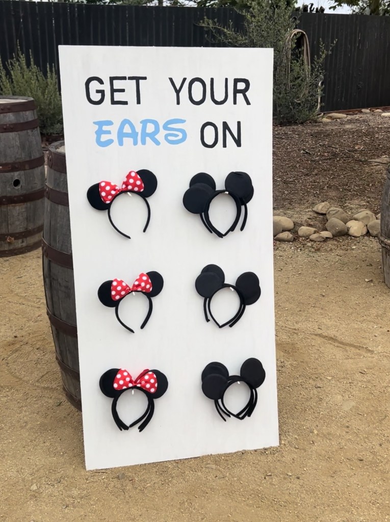 For the goodie bag table, I like to make custom signs and gift tags for the goodie bags that refer to the theme of the party. I have so much fun making the custom little gift tags! When I can, I also like to put part of the party favors on the kids tables- for a few parties, I’ve given Christmas ornaments as a party favor (my daughter’s birthday party is always in December prior to Christmas), and I just set the ornament on the plate at the kids table. I did kinetic sand for her mermaid party and put the little sandcastle carrier on the plate as well! It’s also not always a “table,” for a few parties I’ve made little “walls” holding the party favor! Like Mickey Mouse ears, aviator sunglasses, donuts, etc.