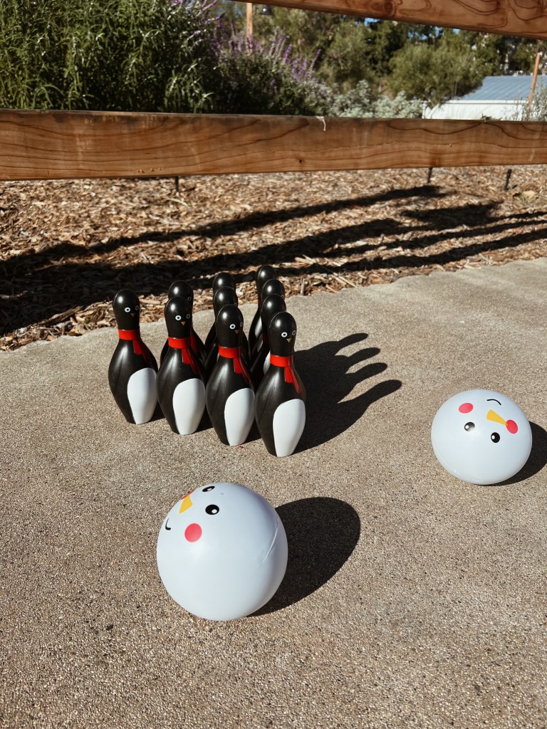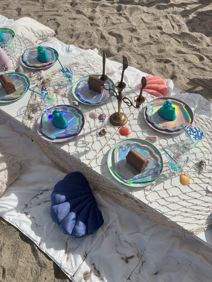 I usually start with our kids tables, my girlfriend made these miniature white tables during COVID and we’ve used them for literally every party ever since. They’re so cute and perfect for kids to sit around on the grass! The first thing I think about with the kids table is the center piece- what can I use to decorate down the middle of the tables? Then from there, I pick what plates and cutlery I want to use and how I want to display plates on the kids tables. I usually like to put some sort of “goodie” for the kids on the plate which they take home afterward. Once I know what my center piece or table runner is going to be, I like to have that tie into the decor the other tables as well.