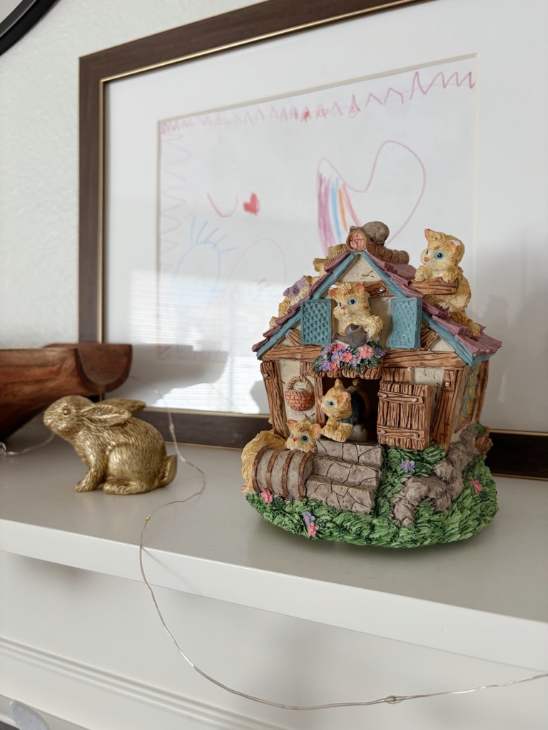 + the cute little snow globe and house figurine were actually the kids great-grandparent’s, they’re both music boxes. They’re so cute and perfect for Spring!