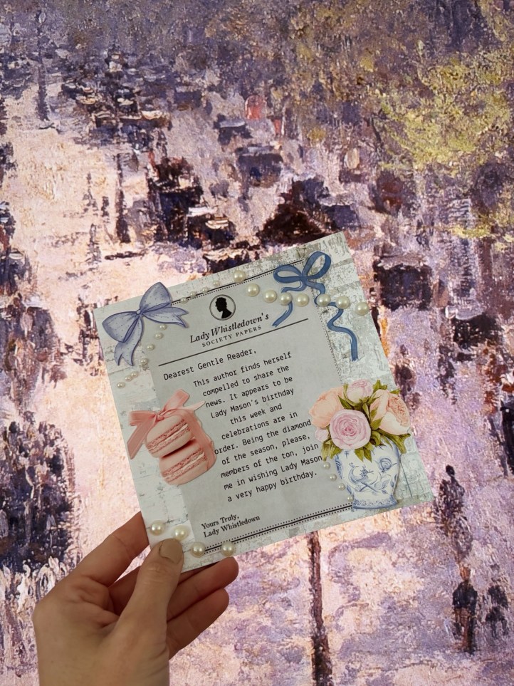 I went to Home Goods and found the perfect white and blue floral mug which was giving instant Bridgerton vibes, then I went to Hobby Lobby and picked up some scrapbooking paper and stickers that I thought matched the vibe as well. Using Canva, I made a little graphic that was a Lady Whistledown newspaper article, and just edited it to customize it with my girlfriend’s details- which I thought was super fun and knew she would love.